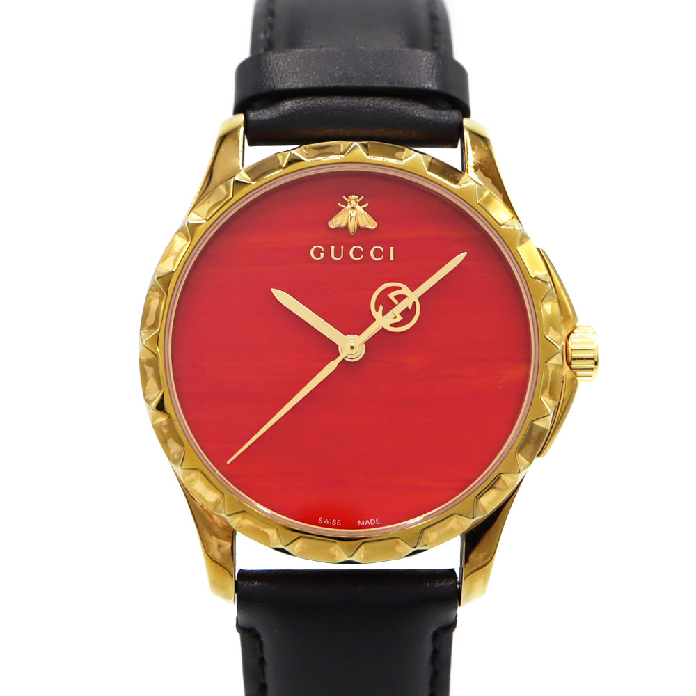 時針と分針の二針タイプのGタイムレスです。レザーベルトですが文字盤にハチのマークや薄くGGマークが施されているので、カッチリとした印象と遊び心のあるデザインを同時に感じたい方にオススメです。