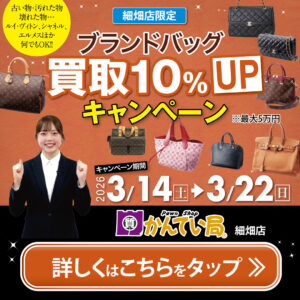 2026年3月14日から3月22日の期間で、質屋かんてい局細畑店限定「ブランドバッグ買取10%アップキャンペーン」を開催いたします!