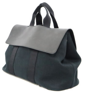 ケリーバッグを想像させる台形フォルムに、キャンバスとレザーを組み合わせたカジュアルな印象です。