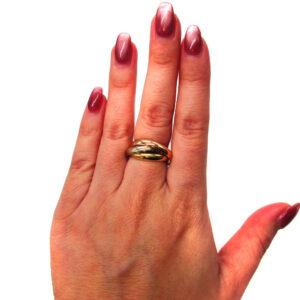 トリ二ティリングはホワイトゴールド、イエローゴールド、ピンクゴールドの三色のゴールドのリングが重なったデザインが特徴です。