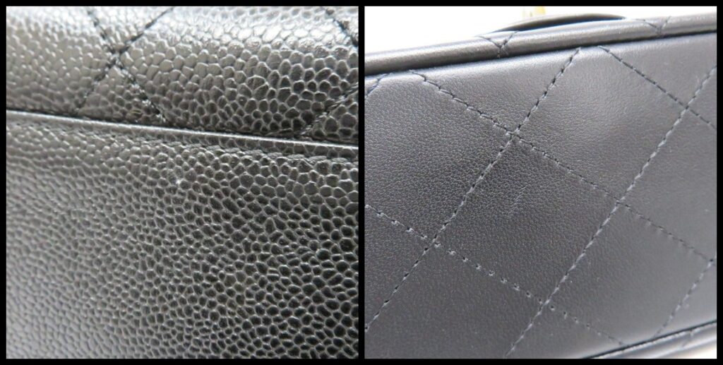 シャネルのキャビアスキンは、表面に細かいつぶつぶとした凹凸があり、傷がつきにくく耐久性が高いのが魅力です。
