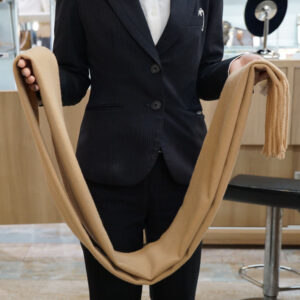 老若男女問わずお使い頂ける巻き方で、端の部分をずらしたり、結び目の位置を変えたり、すこしねじりを加えたり、簡単にアレンジをすることができます!