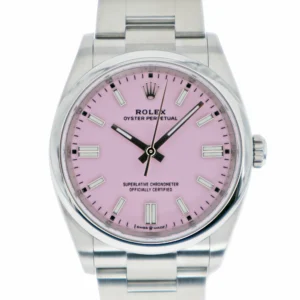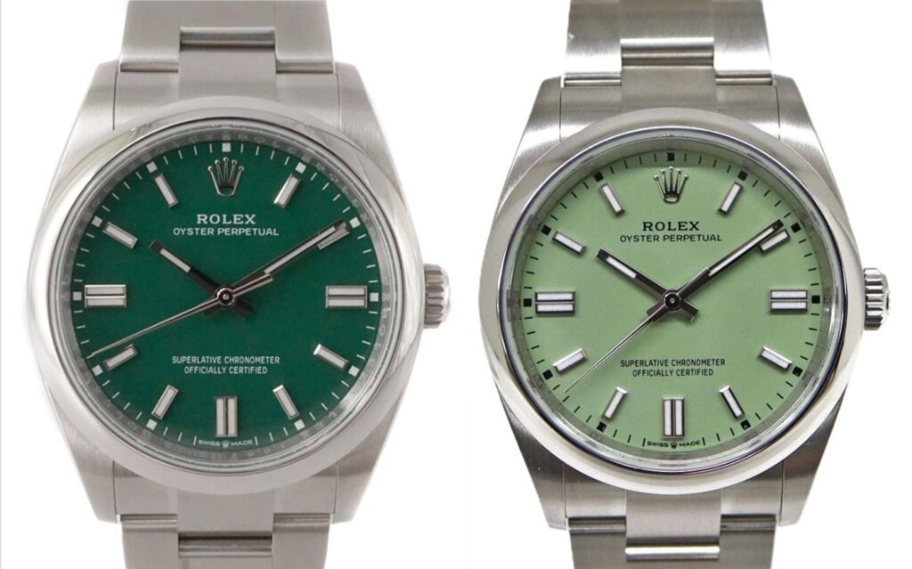 旧モデルでは、シルバー、ブラック、ブルーといった比較的落ち着いた定番色が中心でしたが、モデルチェンジされた現行モデル「Ref.126000」では、ピスタチオ、ターコイズ、キャンディピンクといった、鮮やかでポップなラッカーダイアル(通称「ステラ文字盤」カラー)が導入されました。