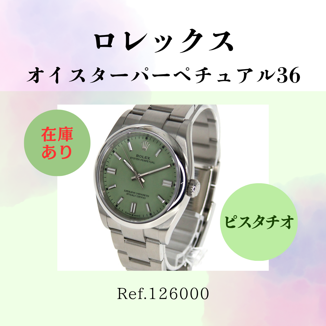 今回は、ロレックス オイスターパーペチュアル36 ピスタチオ 126000 をご紹介させて頂きました。