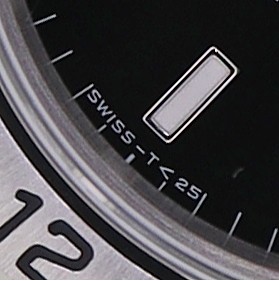 文字盤下部に「T SWISS MADE T」や「T SWISS T」といった、トリチウム(T)の使用を示す表記があります。