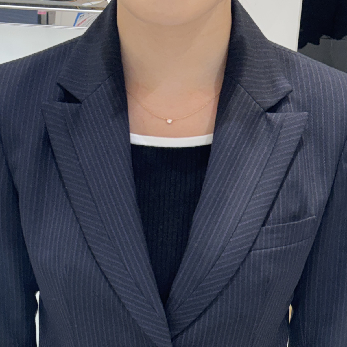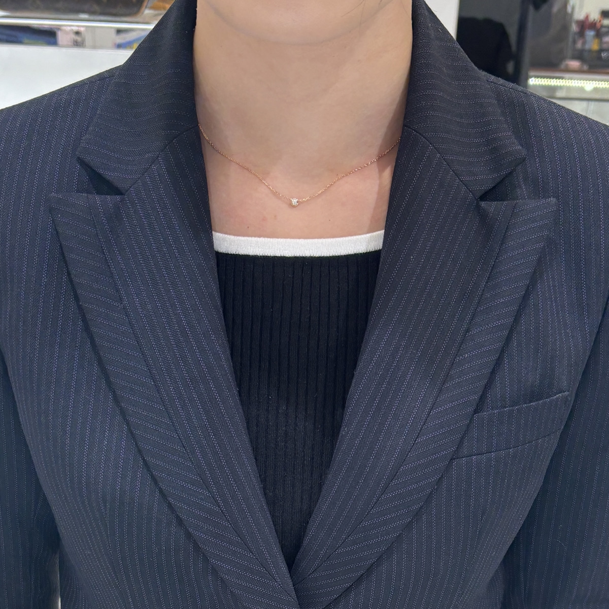 実際に着用すると控えめで清楚な印象になり、毎日のお仕事でも自然に取り入れやすいデザインと言えます。