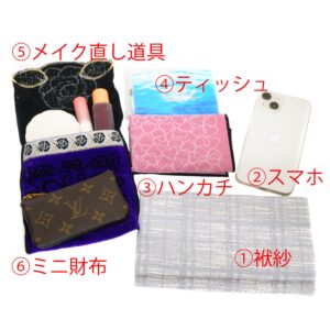 今回は【袱紗(ご祝儀袋)・スマートフォン・ハンカチ・ティッシュ・メイク直し道具・ミニ財布】の6点がきちんと入るかどうかをお見せしていきます!