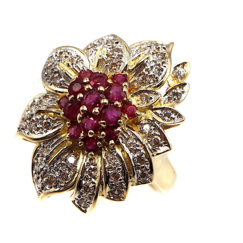 K10より金色が濃いため、ダイアモンド、サファイア、ルビーなどの貴石と相性が良いです。