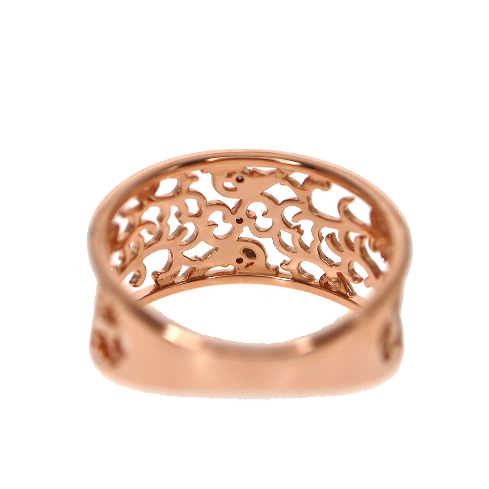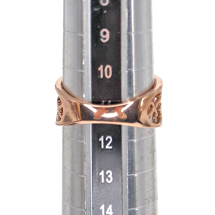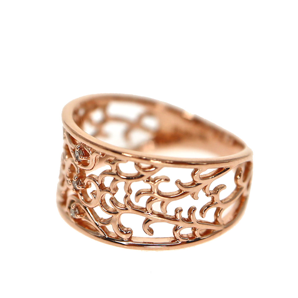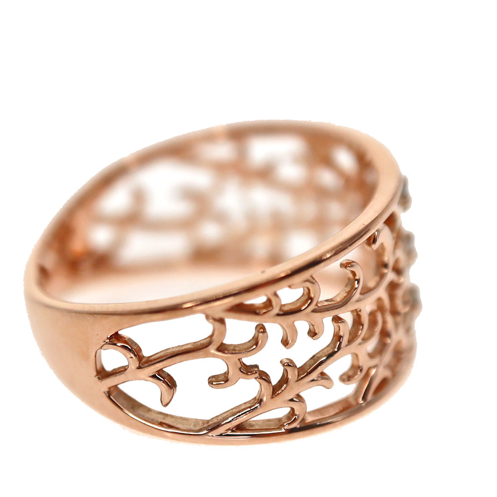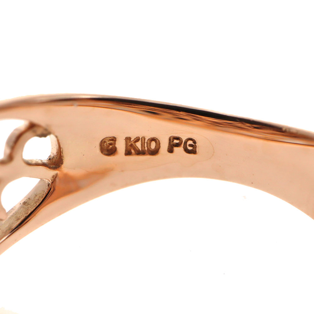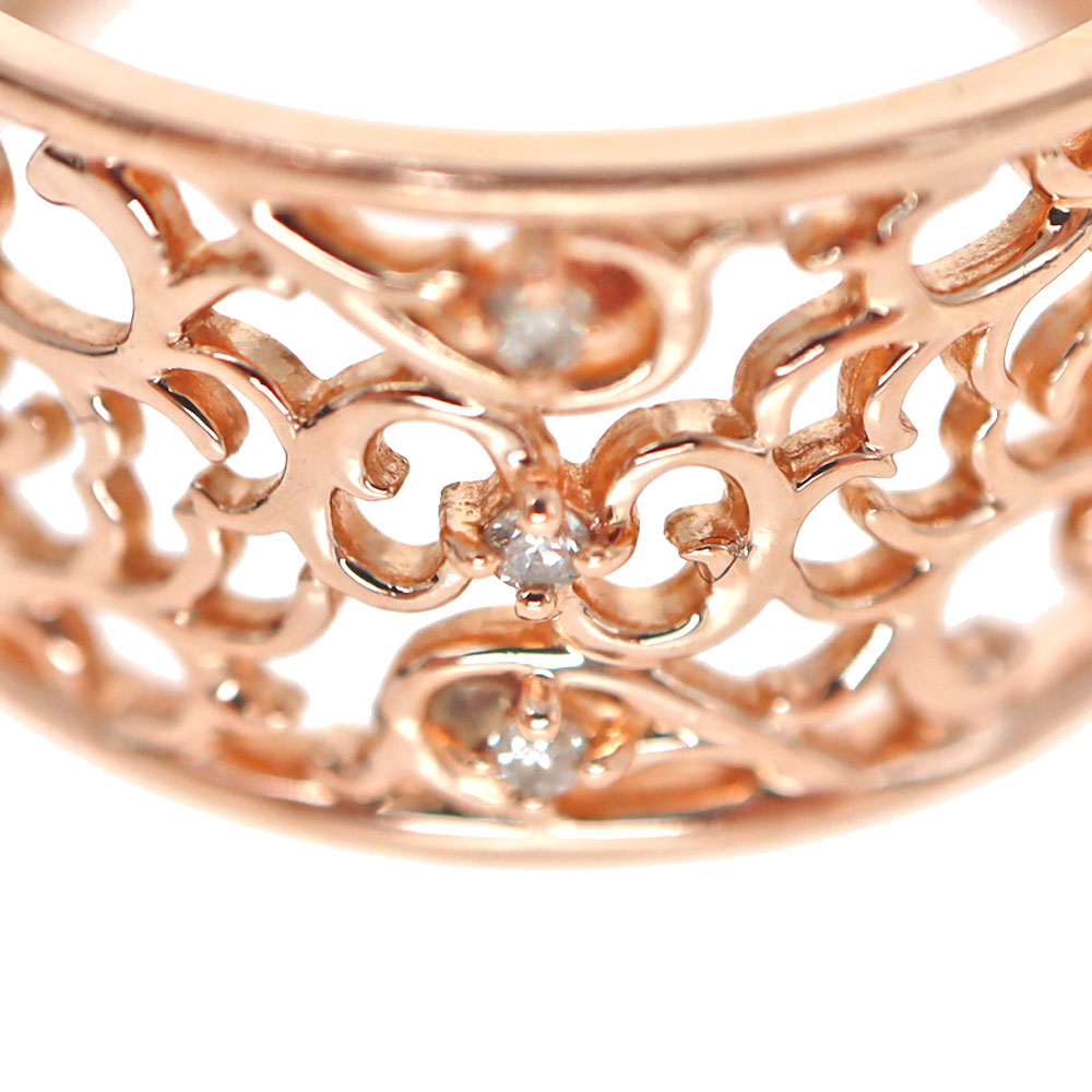 10金のピンクゴールドが使用されたリングです。 繊細にデザインされた模様の中心にダイヤが3つセッティングされており非常にかわいらしい造りとなっている指輪です。 お探しの方はこの機会に是非いかがでしょうか。