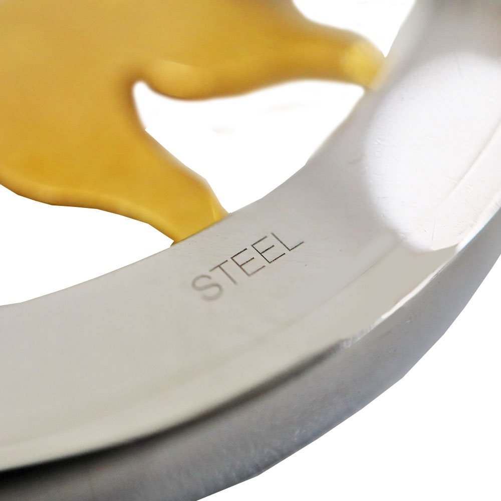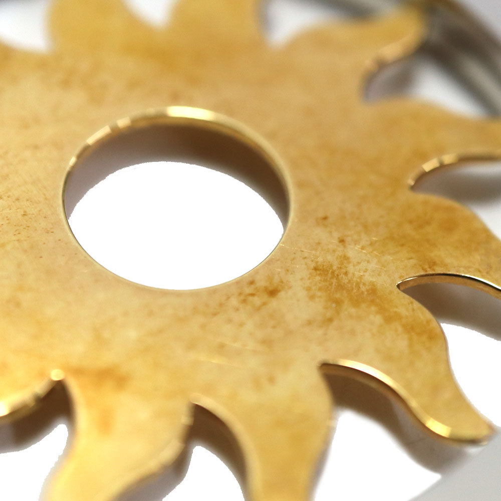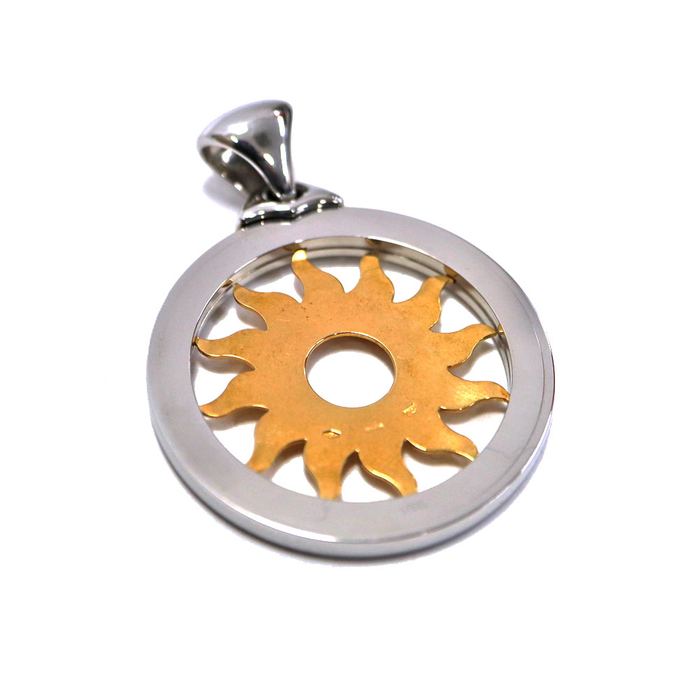 力強く輝く太陽モチーフが印象的なデザイン。 ステンレススチールとイエローゴールドのコンビネーションが上品な存在感を放ち、胸元に華やかさを添えます。