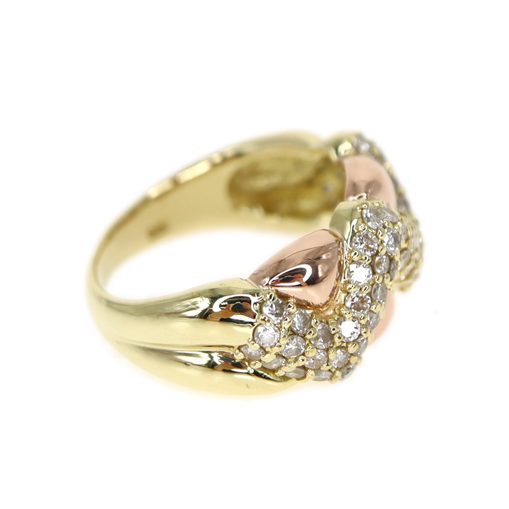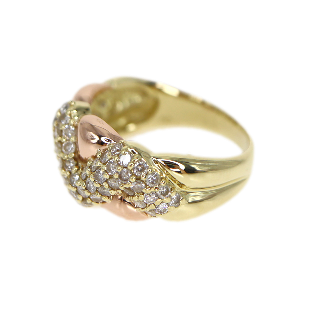 イエローゴールドのリングに、アクセントとして一部正面にピンクゴールドが施されています。 シンプルながらもデザイン性があるので、他の人とあまり被ることがないアイテムです。 1.00ctものダイヤモンドがキラキラと輝き手元を華やかにしてくれます。
