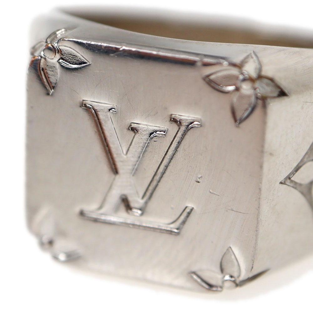 印台リングのような重量感あるリングにLVのロゴが刻印されています。 サイドにはモノグラムフラワーなどもデザインされているので、どこから見てもヴィトンらしさがあります。