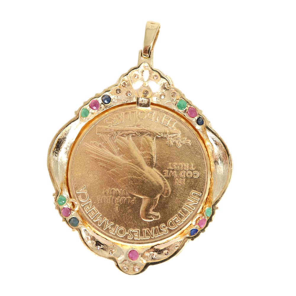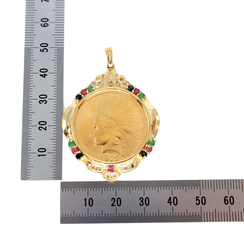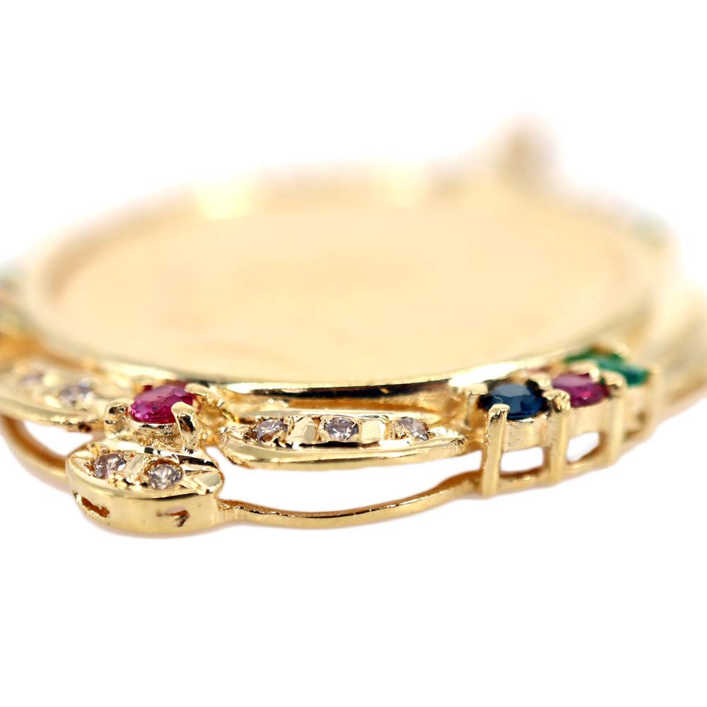 K18の枠にセットされたコイントップです。 コイントップの中では珍しくインディアン金貨が使用されたお品。 周りにはマルチカラーストーンがついているアイテムですので男女問わずお使いいただけるデザインとなっており、資産としてだけでなくコレクションとしてもおすすめです。 この機会に是非いかがでしょうか。 ※尚、当サイトの販売金額より店頭での販売金額の方をお安く設定させて頂いております。予め、ご了承下さいませ。(一部セール品等を除く) |