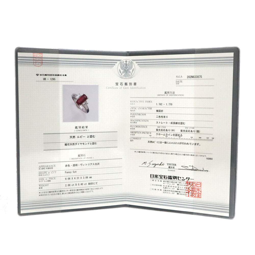 | 素材 | Pt900【プラチナ900】 ルビー:2.00ct ダイヤモンド:0.40ct |