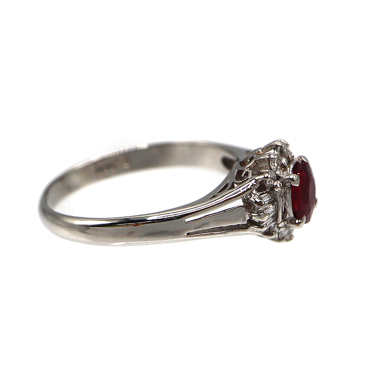 深みのある赤色が魅力的なルビーをあしらった、Pt900製の上品なリングです。