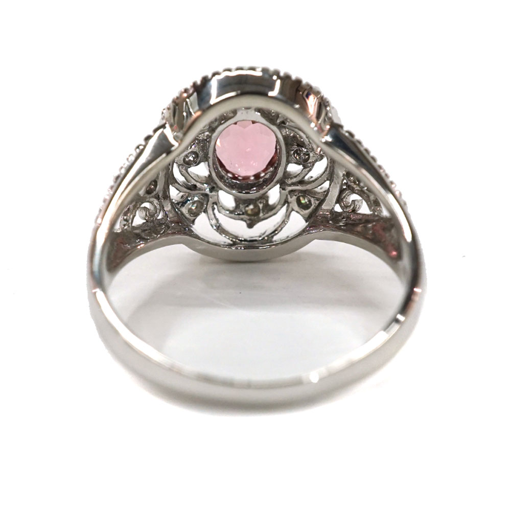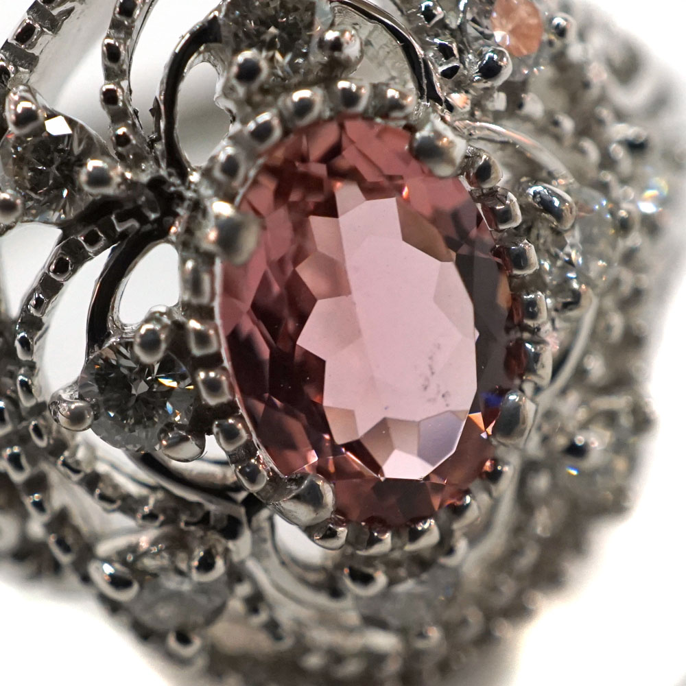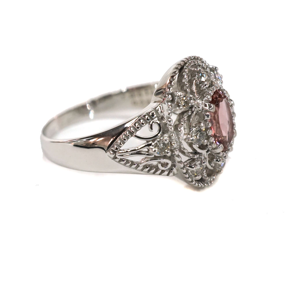 鮮やかなピンクトルマリンとダイヤがあしらわれた可愛らしいリングです。 トルマリン周りのデザインがクラシカルな印象です。 指元のアクセントになります。 お探しの方はこの機会にぜひいかがでしょうか。