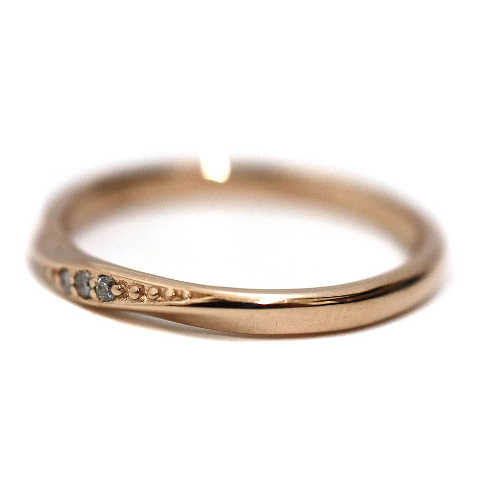 0.01ctのダイヤモンドが散りばめられた、細めのデザインリングとなっております。 そのままつけても、重ね付けしても使いやすいアイテムです。 この機会に是非いかがでしょうか。