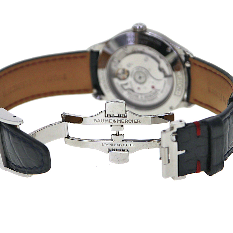 自動巻き自社ムーブメント「ボーマティック」が、この美しいタイムピースの中に搭載されています。 同様にエレガントさも備え、ブルーアリゲーターストラップはフルスクエアで、表側は同系色、裏側はボルドーカラーのステッチです。 バックル付近にループステッチが施してあります。