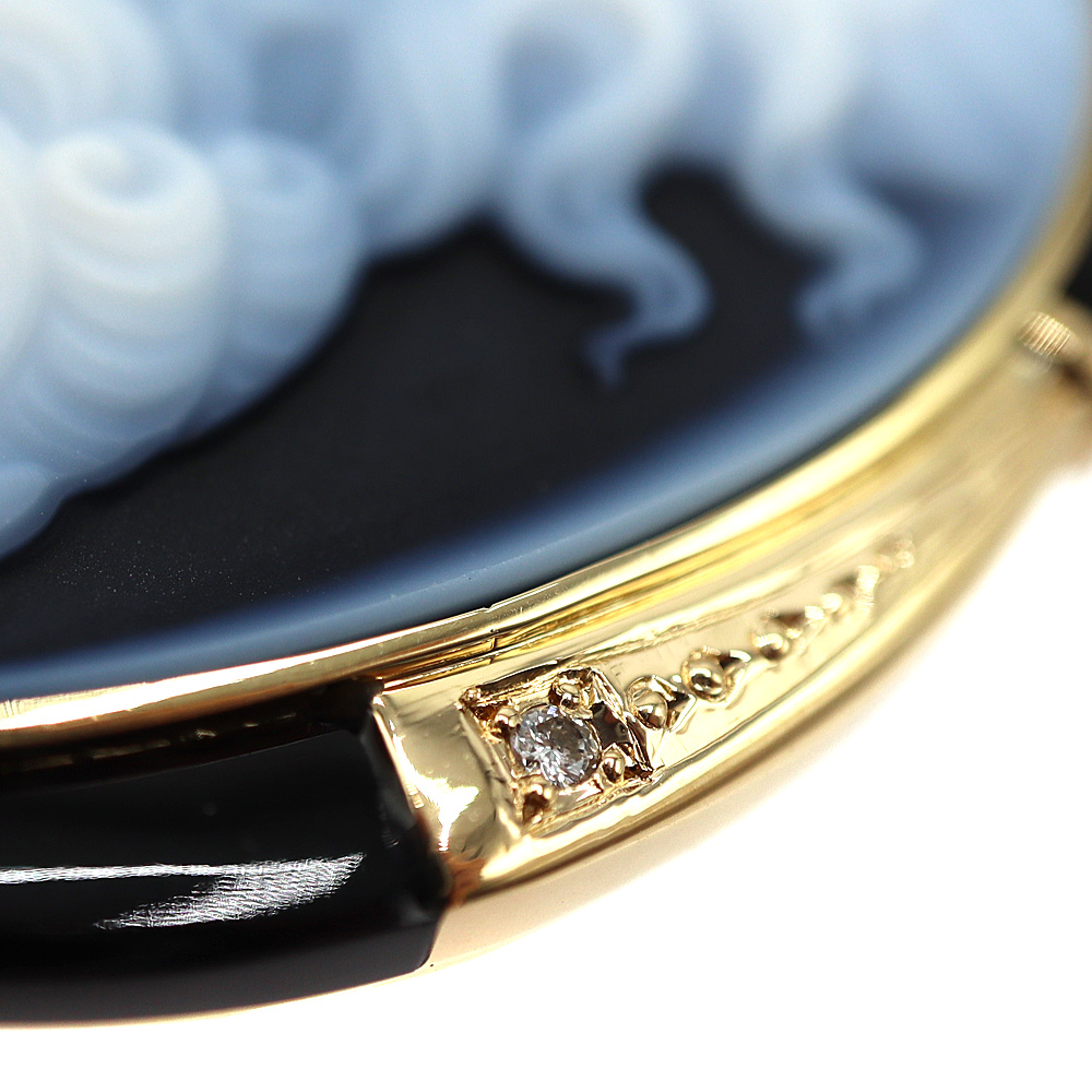 繊細に彫刻されたカメオに、ダイヤモンドを添えた上品なペンダントトップです。