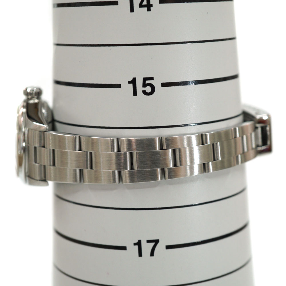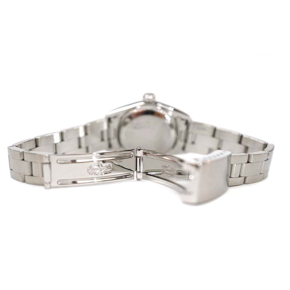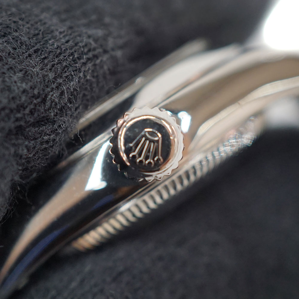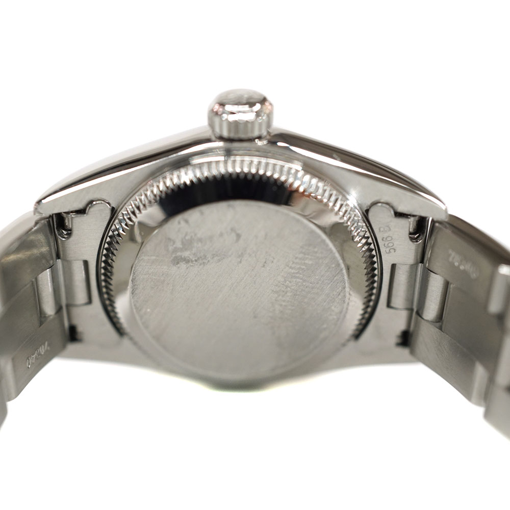 ロレックスでも人気の高いモデル、オイスターパーペチュアルです。 文字盤には光沢のあるシルバーカラーが採用されており、可愛らしい雰囲気となっております。
