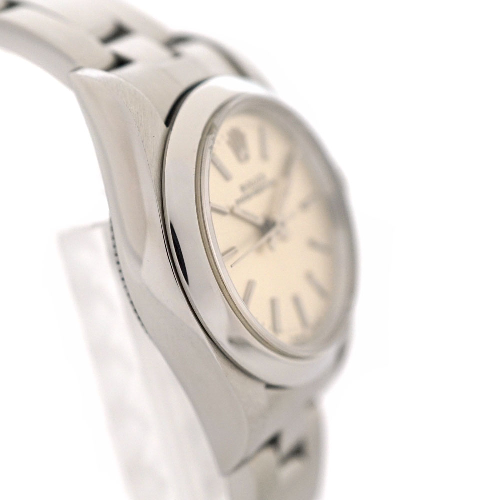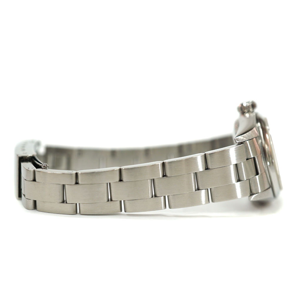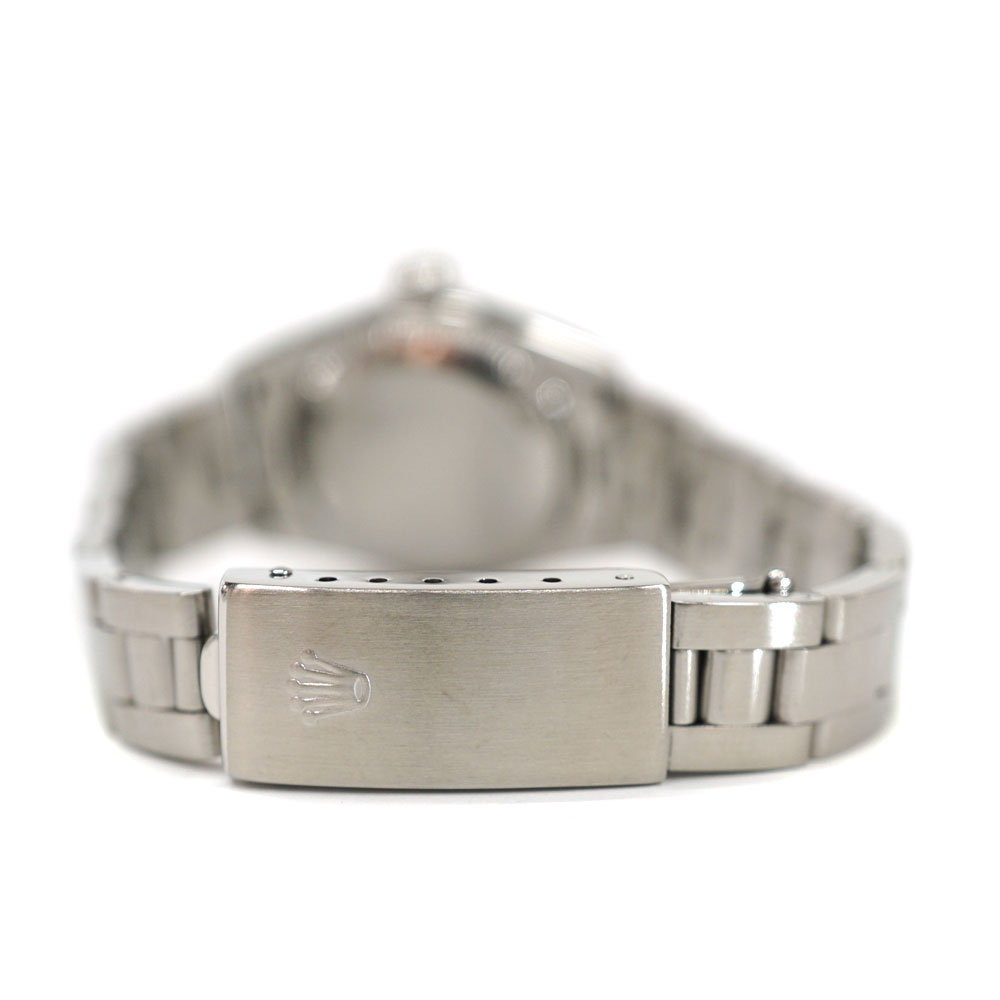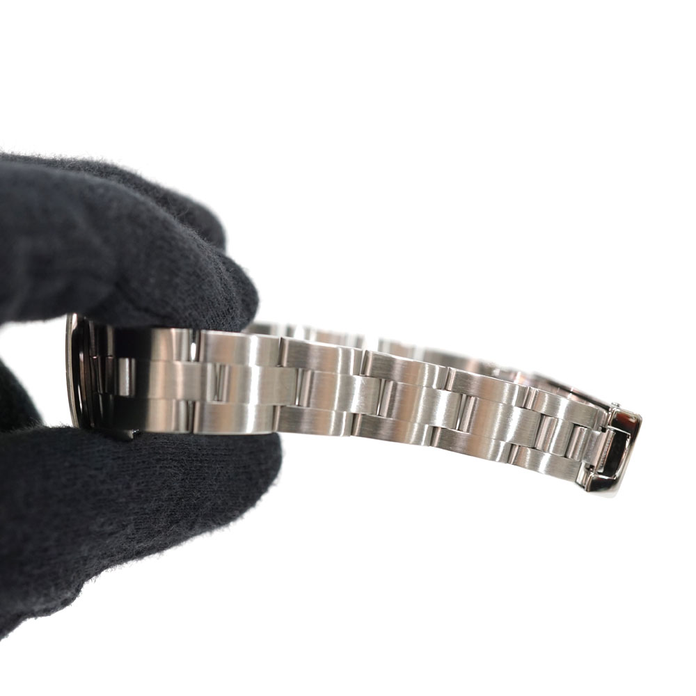 ロレックスでも人気の高いモデル、オイスターパーペチュアルです。 文字盤には光沢のあるシルバーカラーが採用されており、可愛らしい雰囲気となっております。