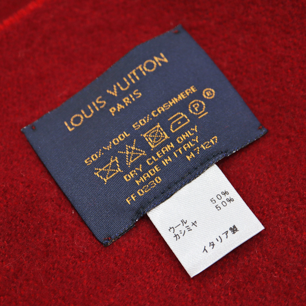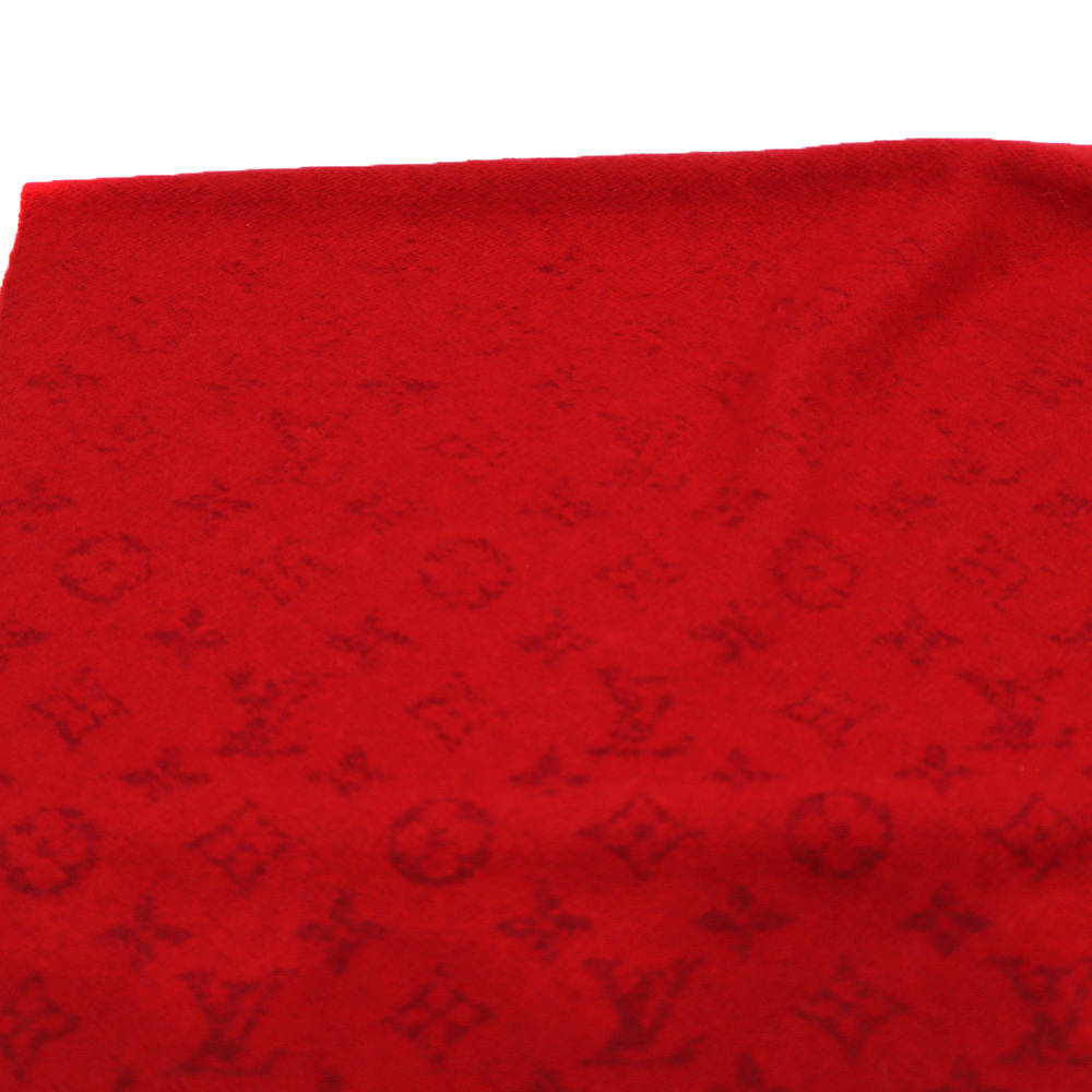 鮮やかなレッドカラーにモノグラムがグラデーションで織り込まれており巻き方によりさまざまな表情を見せます。