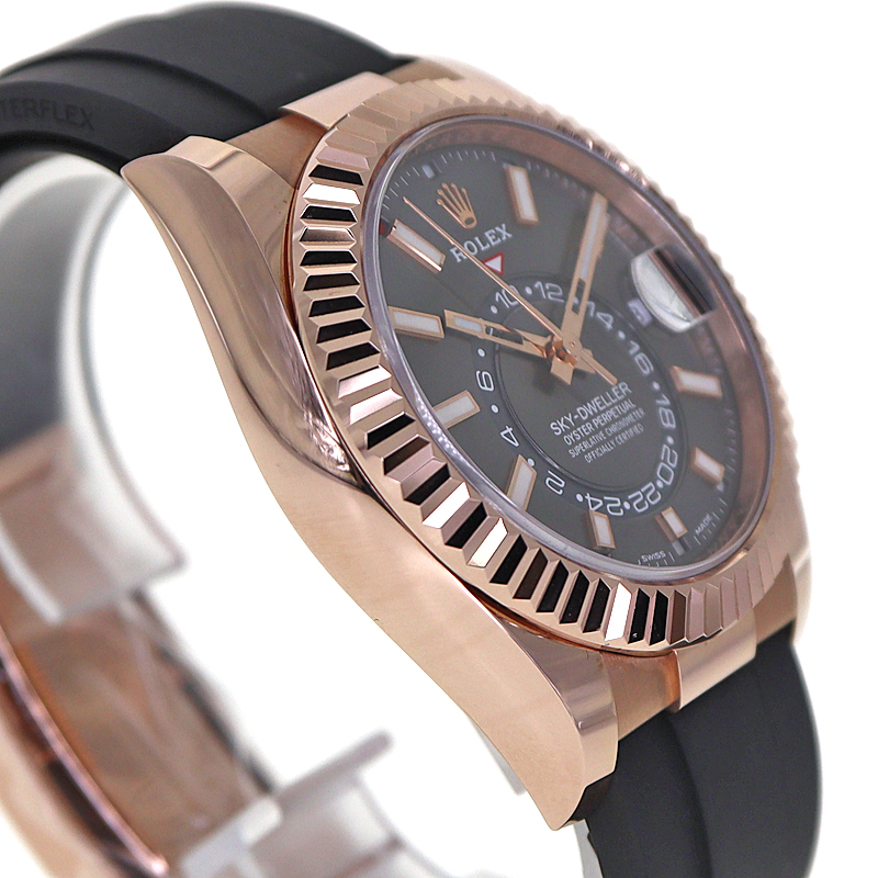 “空の住人”を意味する〈スカイドゥエラー〉は、ロレックス初のアニュアルカレンダー機能を備えた、ケース径42mmの大型ドレスウォッチです。 エバーローズゴールド製ケースにスレートダイヤルを組み合わせた、上品で落ち着いた印象の一本。 オイスターフレックスブレスレットは、ロレックスが独自に開発し特許を取得したストラップで、中心のメタルブレードを高性能エラストマーで覆うことで、高い堅牢性と快適な装着感を両立しています。 24時間表示のインダイヤルで第2時間帯を確認でき、各アワーインデックス外側の小窓ではポインター式で月を表示。 搭載ムーブメント「キャリバー9001」は、ロレックスが開発した中でも最も複雑な機構の一つで、ベゼル位置を感知するセクレターウィールによって各機能をスムーズに切り替えることができます。 お探しの方はこの機会に是非いかがでしょうか。