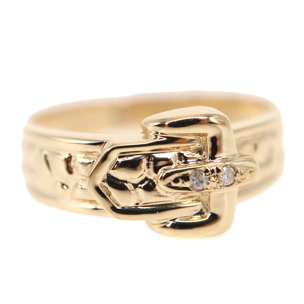 ベルトデザインの可愛らしいリングです。 バックルの部分に沿えるようにダイヤモンドがセッティングされており煌びやかな印象のお品となっております。 お探しの方はこの機会にぜひいかがでしょうか?