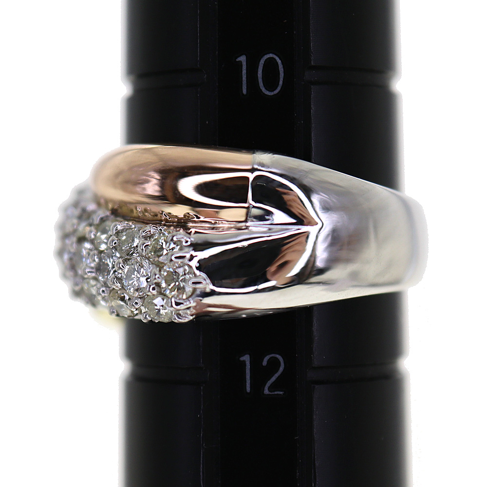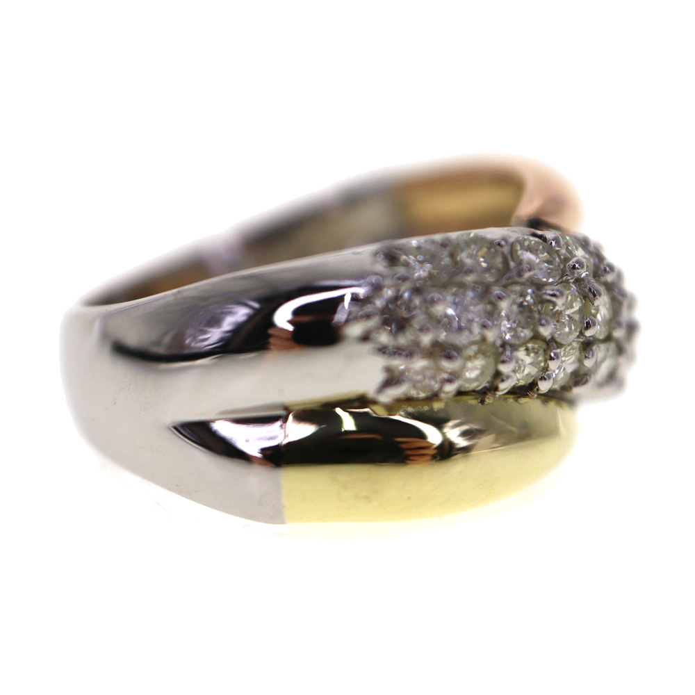スリーカラーのオシャレなリングになります。 シルバー部分はプラチナ素材となっております。 ダイヤモンドが1.02ctセッティングされています。 この機会にぜひいかがでしょうか。