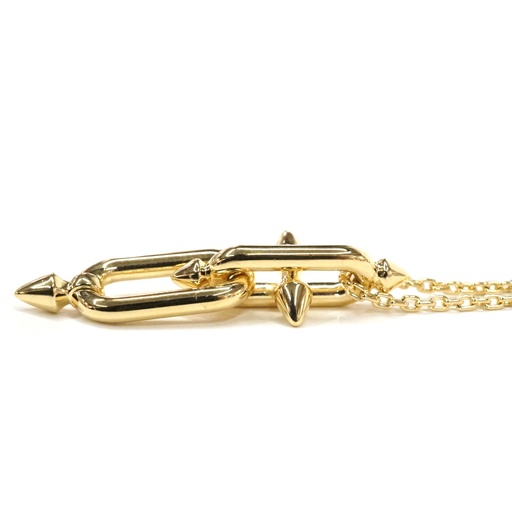18K ゴールドで作り上げられた鋭い槍形モチーフと、柔らかな曲線を描くリンクが印象的なルックを演出します。