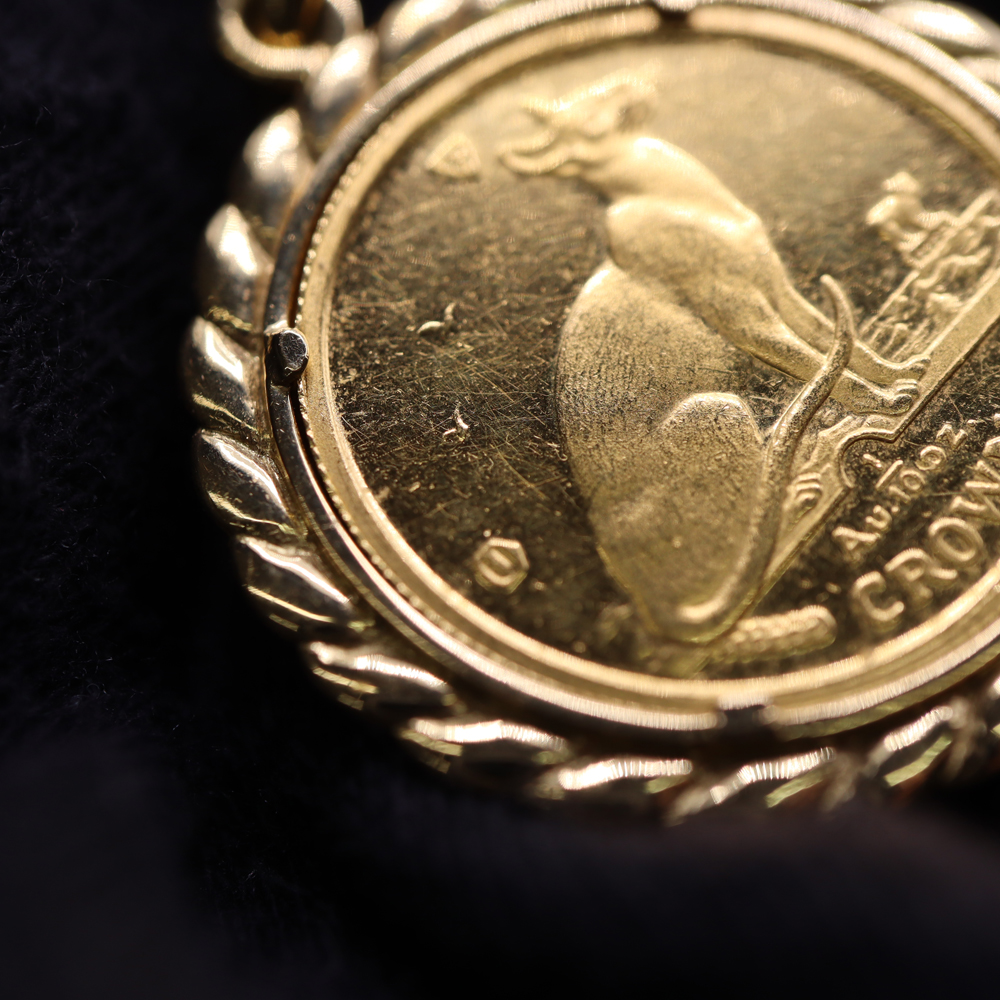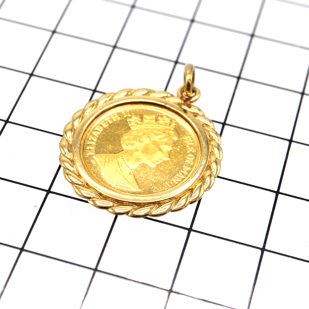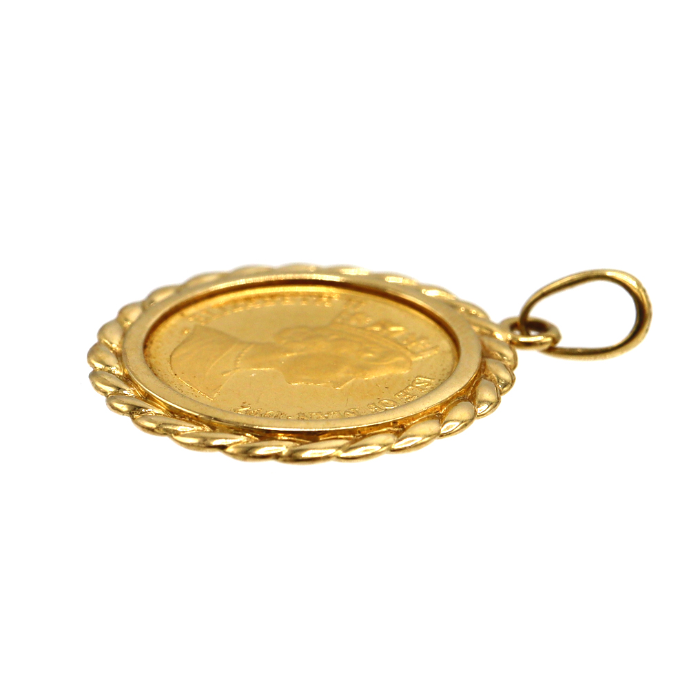 1/10oz(オンス)サイズのコインを、しっかりとしたK18イエローゴールドの枠で囲んだペンダントトップです。