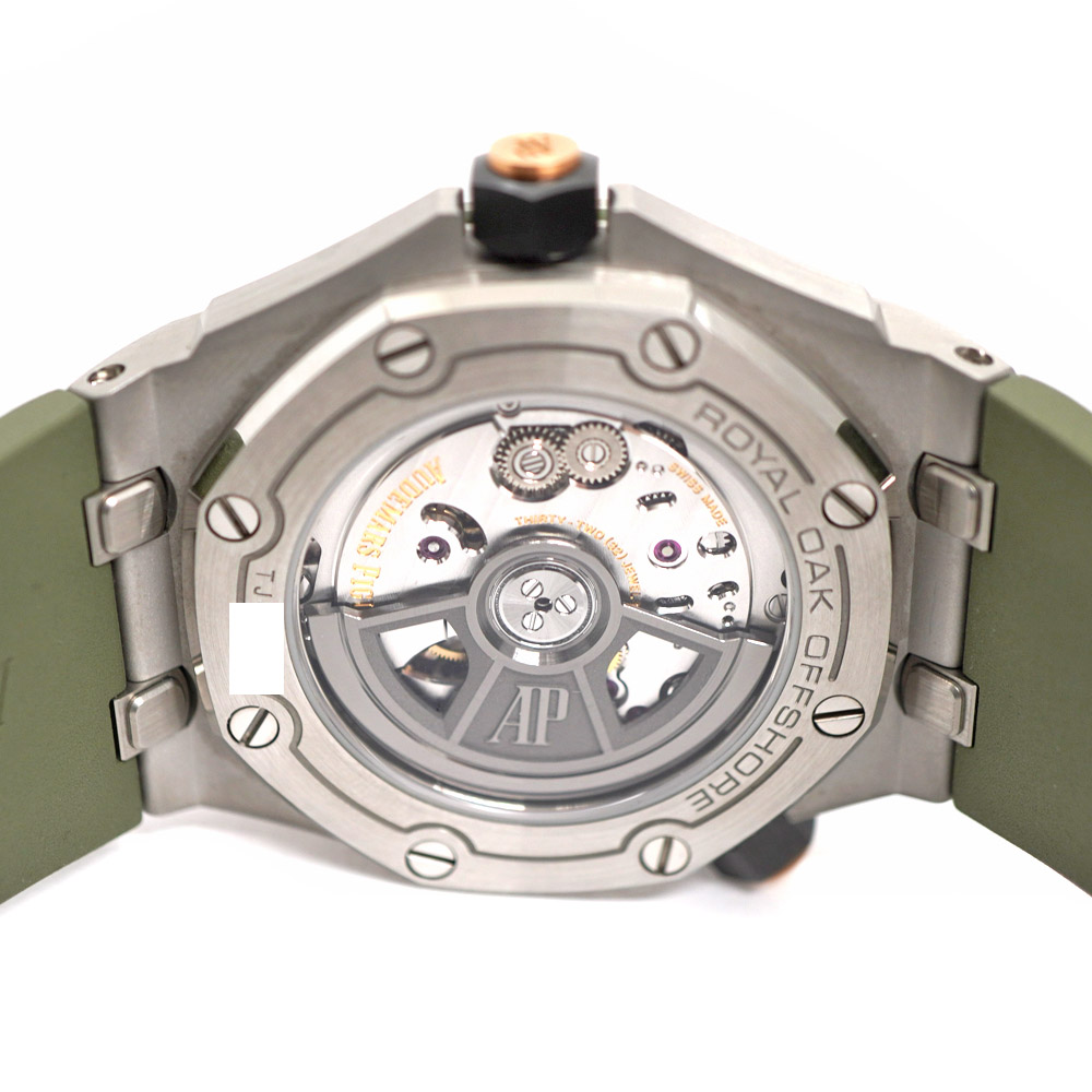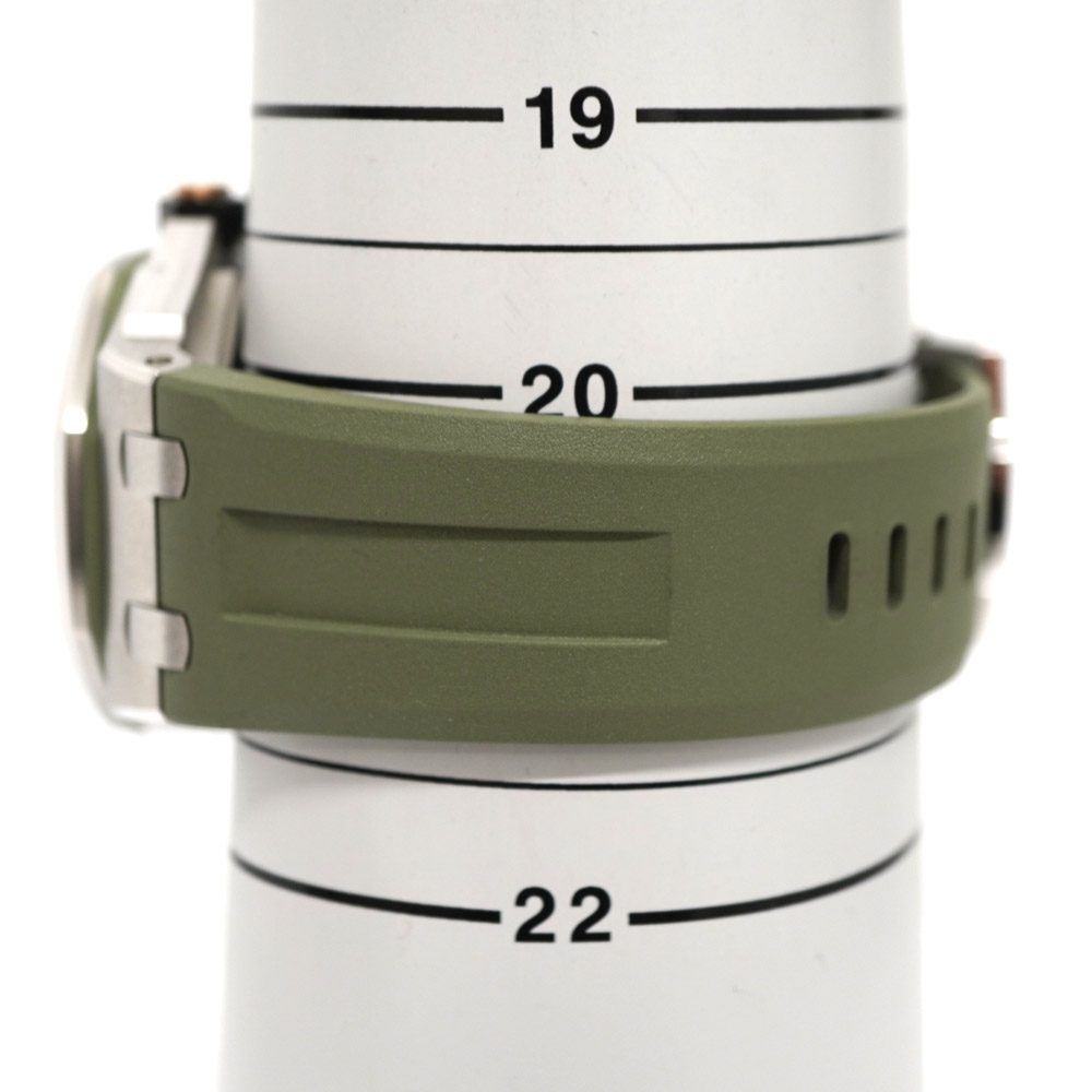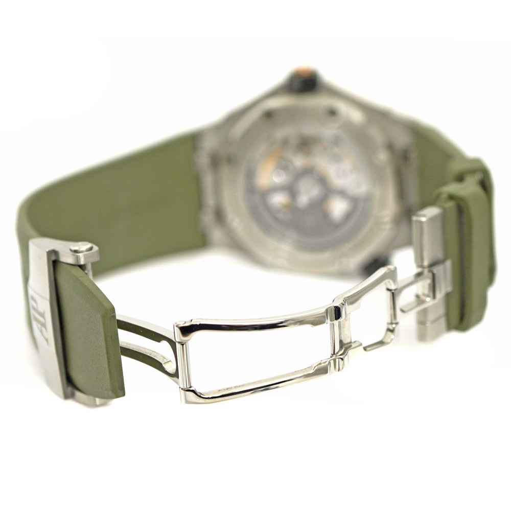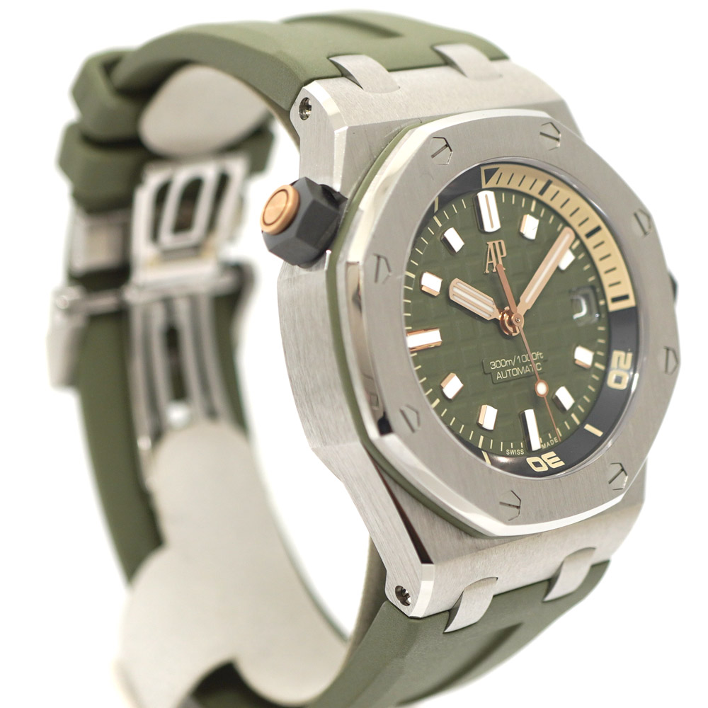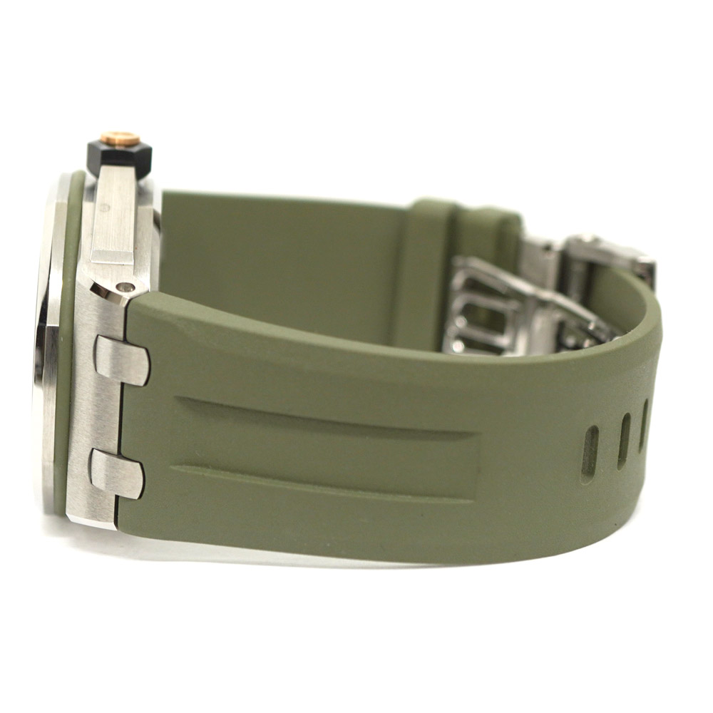 ロイヤルオークをベースに300mもの防水性能を持った迫力のある1本です。 「メガタペストリー」模様のカーキグリーンダイヤル、蓄光処理を施したピンクゴールドのアプライドアワーマーカーとロイヤルオーク針、60分から15分までのゾーンがベージュカラーの回転式ブラックインナーベゼルでデザインされた文字盤が魅力的なお時計です。 裏蓋はシースルー仕様となっており、美しいムーブメントの動きや構造を鑑賞できます。 お探しの方はこの機会にいかがでしょうか。