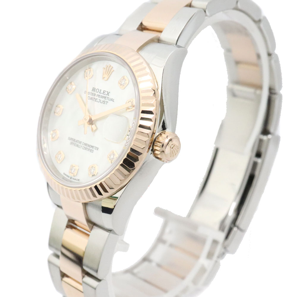 ロレックス三大発明である、デイトジャスト機構、オイスターケース、パーペチュアルが備わった定番人気のモデルです。 キャリバー2236を搭載しており、パワーリザーブ55時間、100m防水など機能面でも優秀です。 こちらは、ステンレス×K18エバーローズゴールドのコンビモデルに、10Pダイヤとマザーオブパール文字盤が組み合わさった豪華なデザインのお時計です。 一本で華やかな印象となり、変わらないデザインは年代問わず長く愛用頂けます。 お探しの方はこの機会にぜひいかがでしょうか。