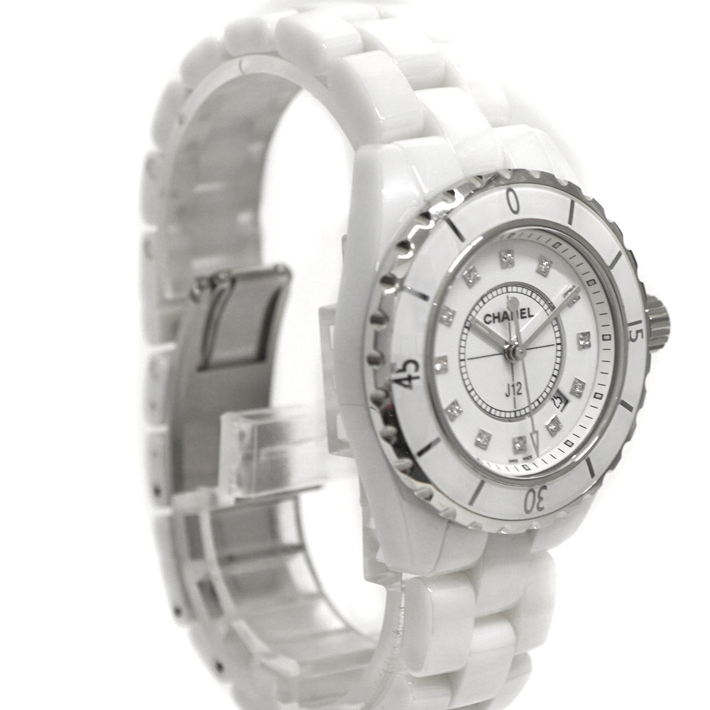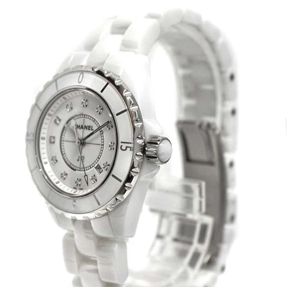シャネルの中でも人気定番のJ12はスポーティな時計ながら上品さも兼ね備えたお時計です。 こちらは文字盤に美しく輝いた12Pのダイヤモンドが装飾されております。 人気モデルの為お探しの方はこの機会に是非いかがでしょうか。 ※尚、当サイトの販売金額より店頭での販売価格の方をお安く設定させて頂いております。予め、ご了承下さいませ。(一部セール品等除く) |