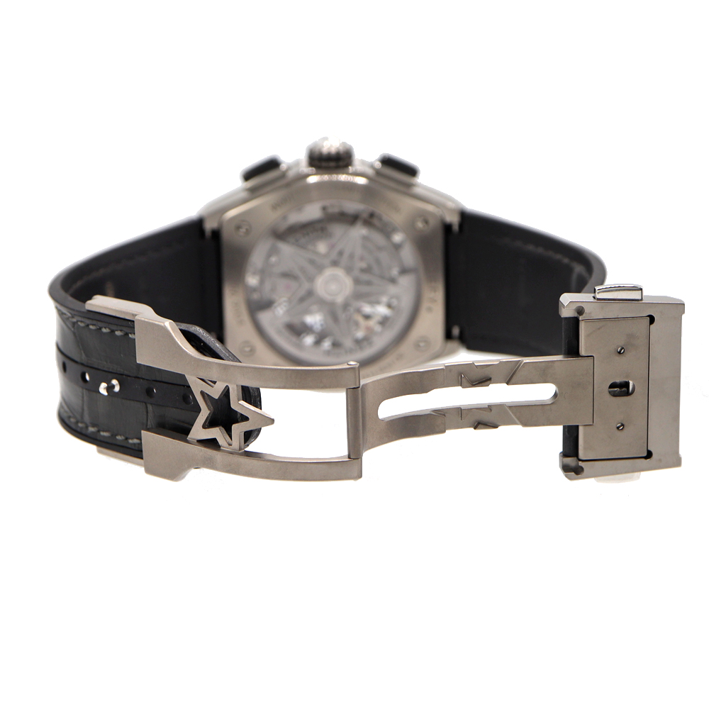 このモデルの大きな魅力は、1秒で針が1周し、1/100秒の計測が可能なクロノグラフ機能で、12時位置にはクロノグラフ専用のパワーリザーブインジケーターを備え、クロノグラフ用と時刻用でそれぞれ独立した脱進機を搭載した高度な構造を採用しています。 手巻きの際、「12時方向に回すとクロノグラフ用ゼンマイ」「6時方向に回すと時刻用ゼンマイ」を巻き上げる仕組みになっており、ゼニスならではのこだわりが随所に感じられます。