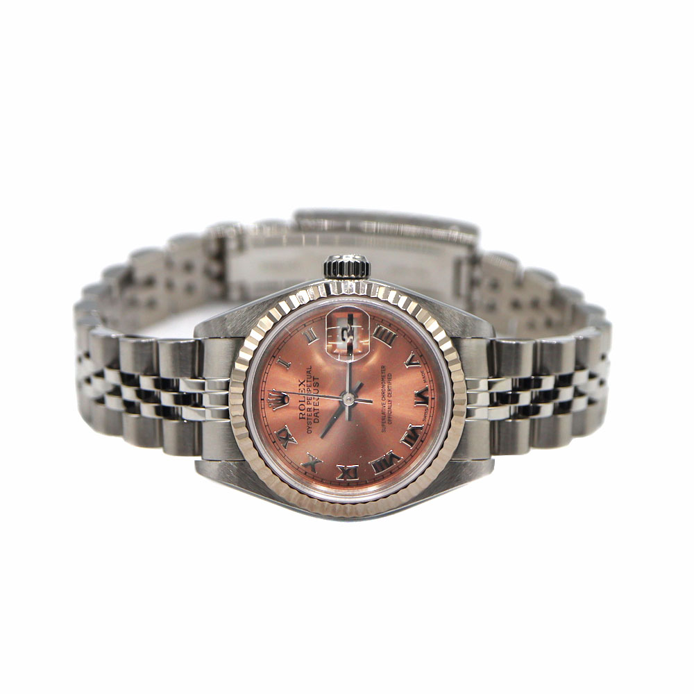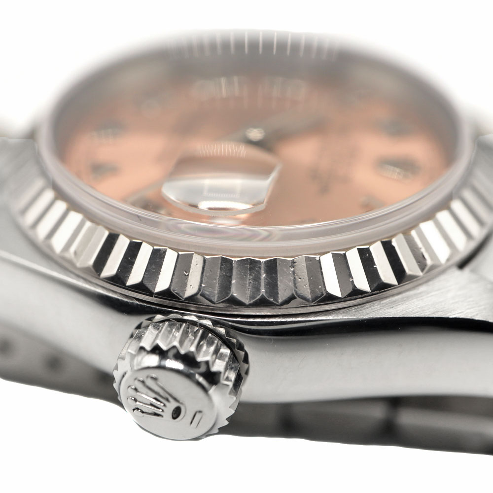デイトジャストとは午前0時頃瞬時に日付が変わるデイトジャスト機構、全回転式ローターを搭載したパーペチュアル機構、ロレックス三大機構を搭載したモデルです。 ピンクの文字盤が非常にシンプルかつ上品です。