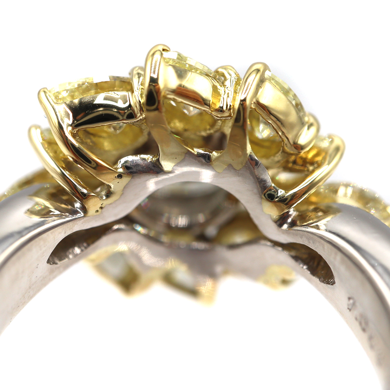 センターに1.058ctの存在感あるダイヤモンドをセットし、その周囲を1.45ctのメレダイヤで贅沢に取り巻いた、華やかなデザインリングです。