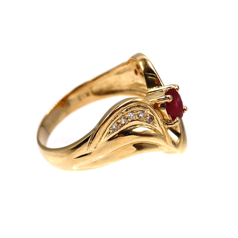 鮮やかなルビー0.55ctと、繊細に煌めくダイヤモンド0.13ctを贅沢にあしらった、華やかさあふれるK18リングです。
