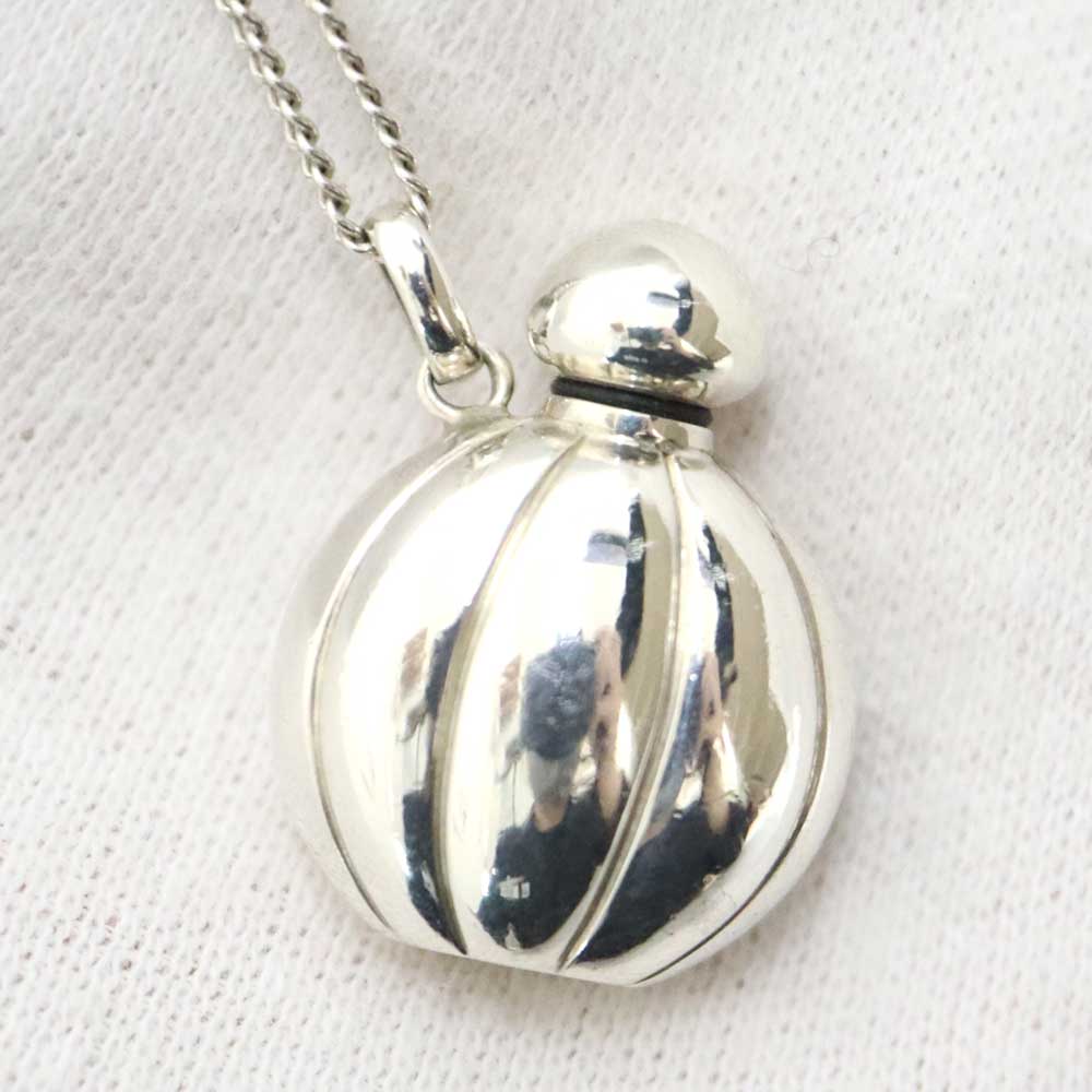 香水瓶のモチーフをした可愛らしいネックレスです。 ボトルの蓋部分が開閉できるようになっています。 この機会に是非いかがでしょうか。
