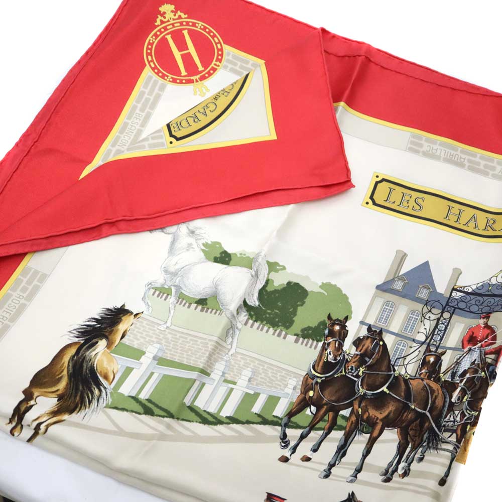 馬と、様々なシーンが切り抜かれたようなデザインが素敵なスカーフです。 レッド×ホワイトで目を惹くアイテム。 この機会に是非いかがでしょうか。