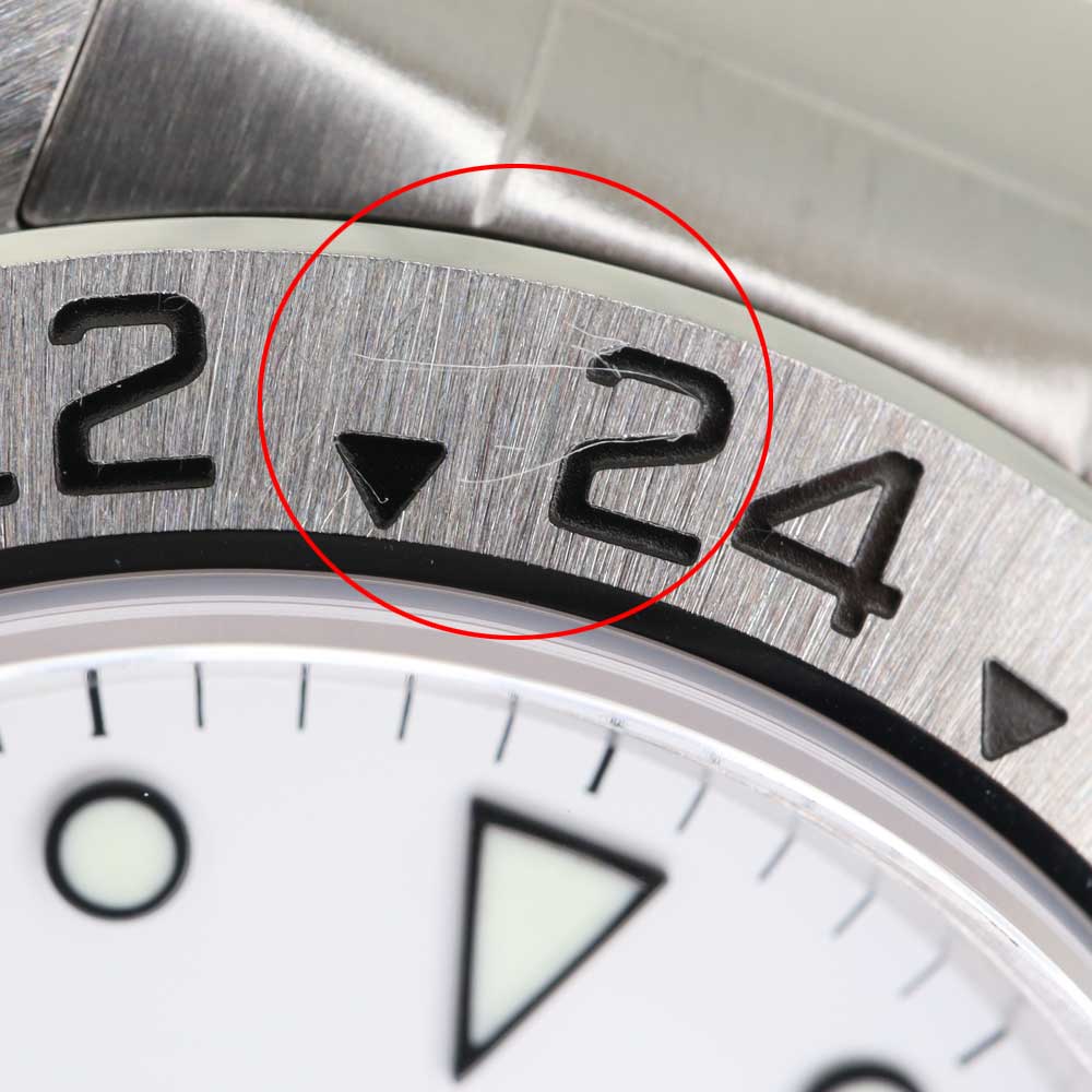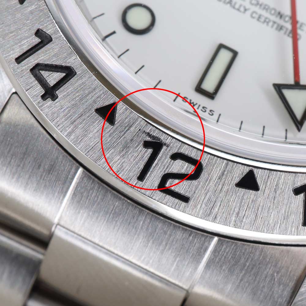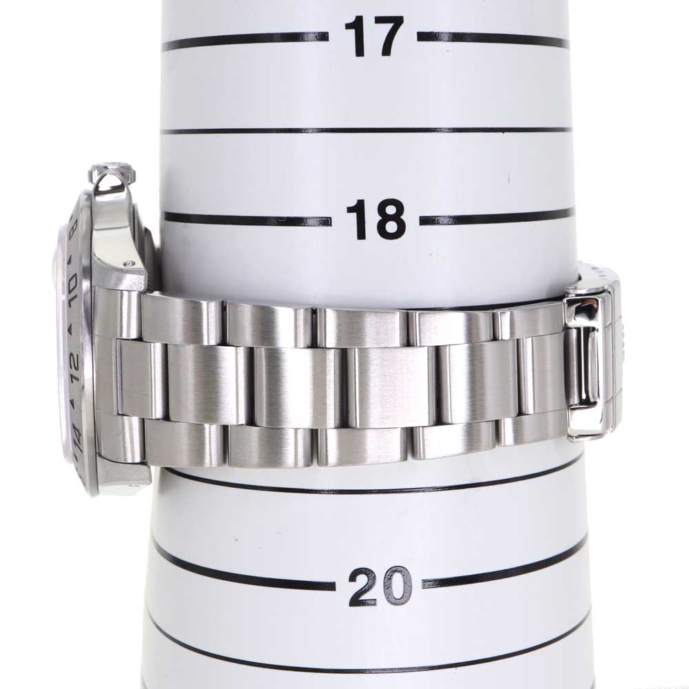 洞窟探検家向けに耐久性、機能性を強化したエクスプローラー2の第三世代のモデルです。 デイト表示、GMT機能、100防水、48時間パワーリザーブなど機能面が優れています。 ベゼル上の文字が少し細くスマートになった印象、ホワイト文字盤が映えるお時計です。 お探しの方はこの機会にぜひいかがでしょうか。