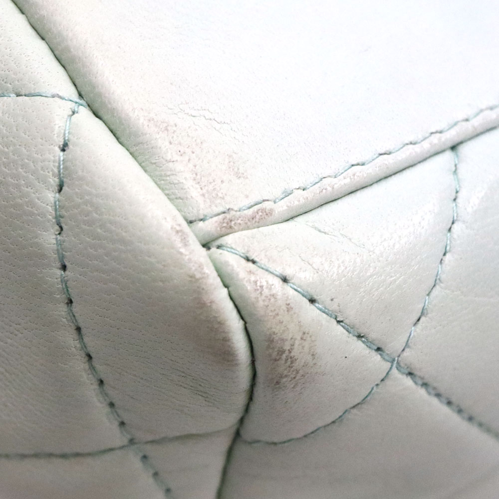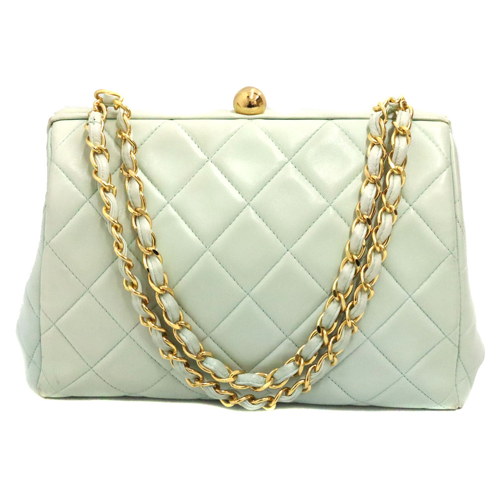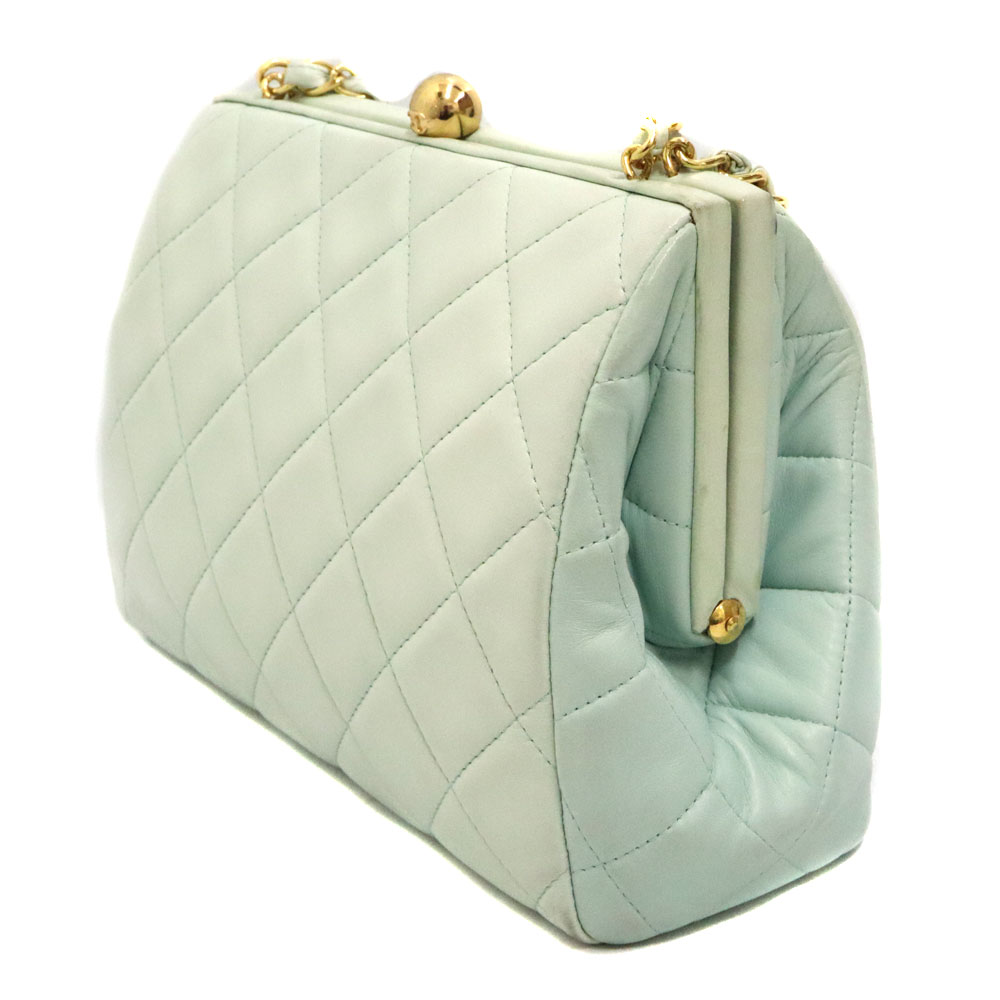 手触りの良いラムスキンで作られたチェーンハンドバッグとなります。 がま口開閉式で、コロンとしたフォルムとミントグリーンのカラーが可愛らしいバッグです。 この機会に是非いかがでしょうか。