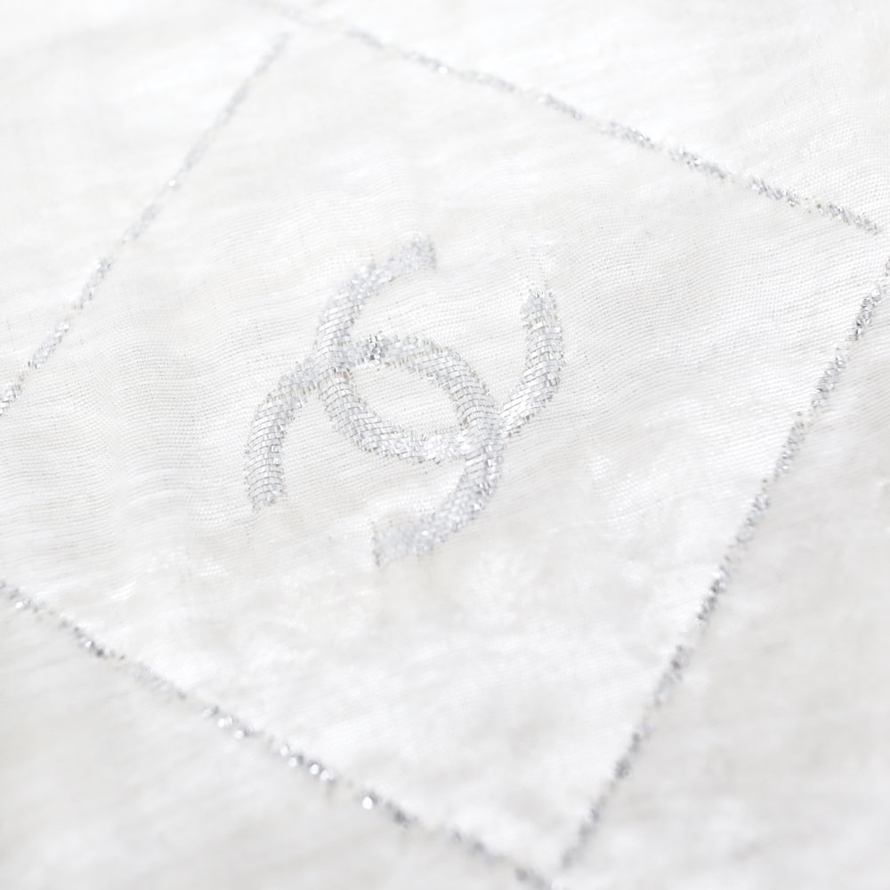 キルティングデザインがシャネルらしいマフラーです。 ホワイトカラーにシルバーラインとココマークがアクセントになっています。 大判サイズなので使い勝手も防寒もばっちりです。