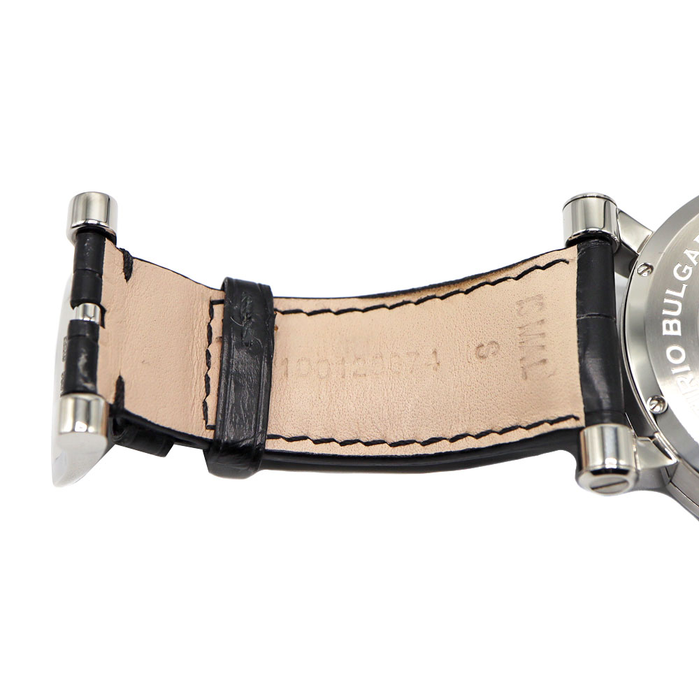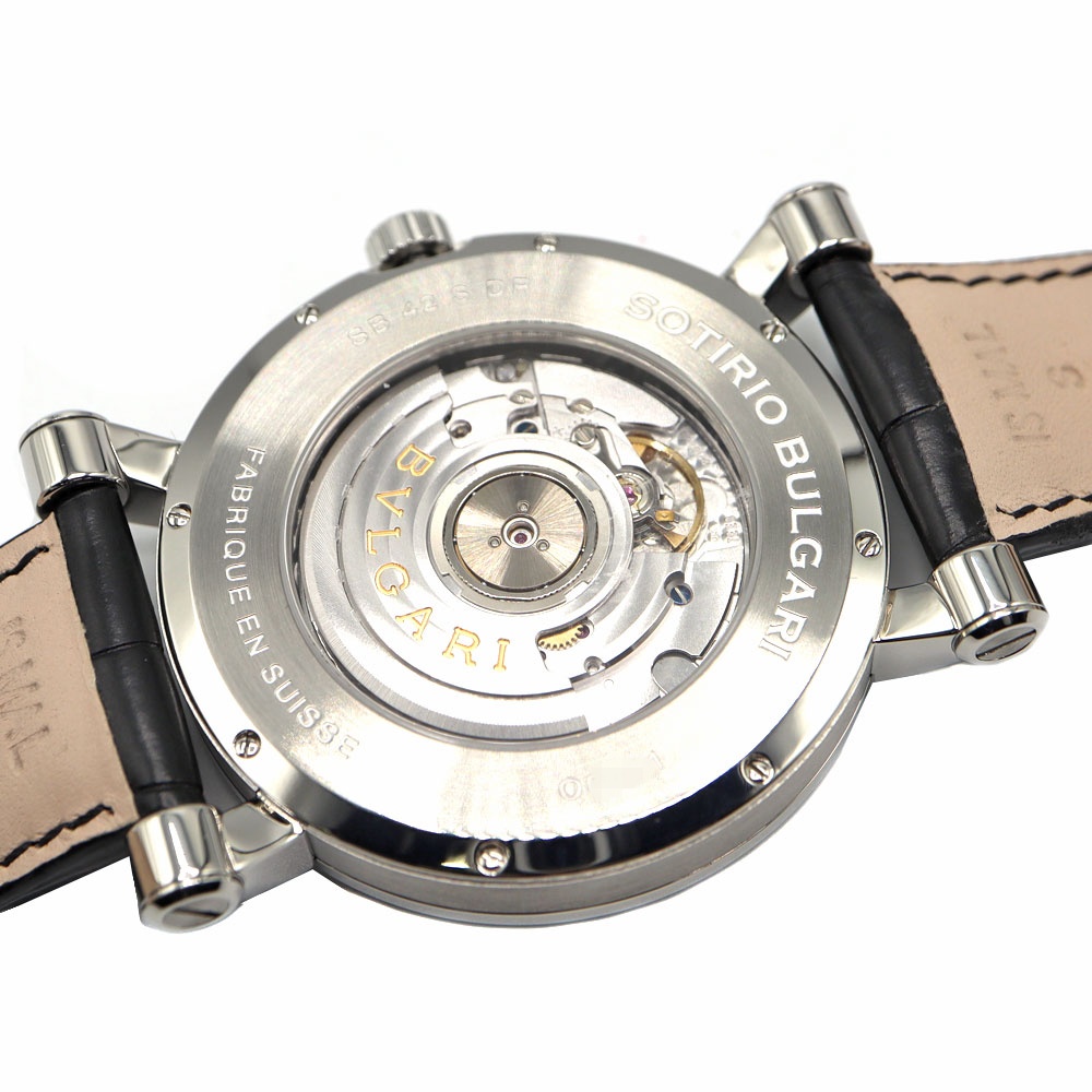 ブルガリの創始者である「ソティリオ・ブルガリ」の名を冠したモデルです。6時位置にレトログラード式ポインターデイトを備えています。 文字盤の扇状の意匠と黒いレザーベルトがシックで大人っぽい印象です。