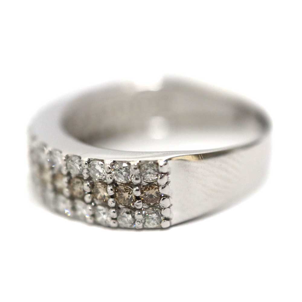 1.08ctのダイヤモンドの輝きが指元を美しく彩る、ラグジュアリーなリングです。 中央には落ち着いたシャンパンカラーのダイヤモンドが配され、上下のダイヤモンドとのコントラストが、洗練された印象を演出してくれます。 気品と存在感を兼ね備えた一本です。 この機会に是非いかがでしょうか。