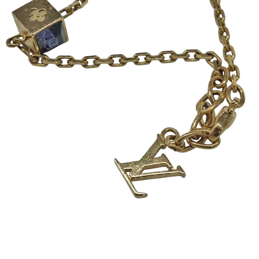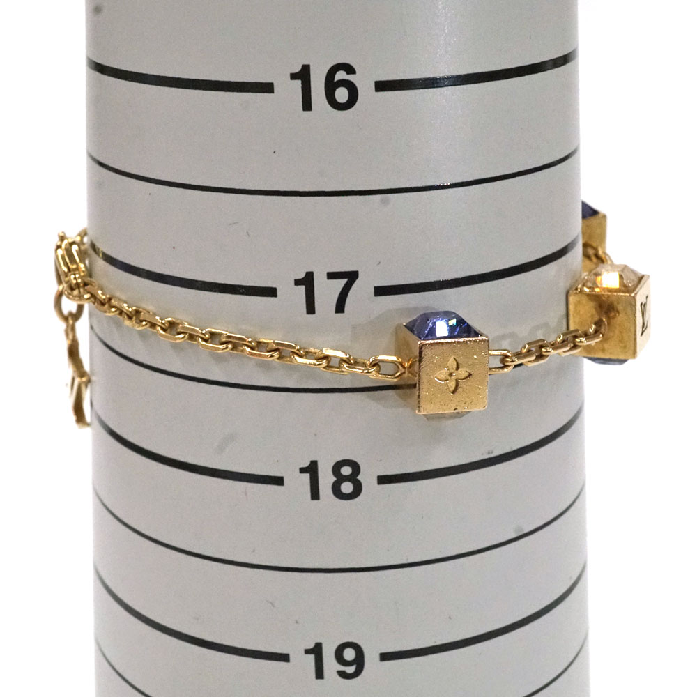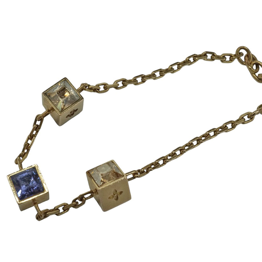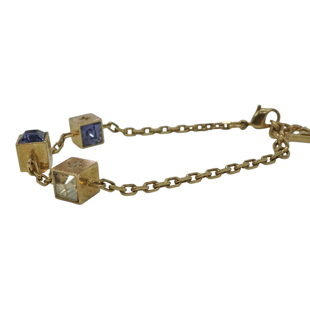 キューブ型のモチーフがあしらわれたおしゃれなデザインのブレスレットです。 パープル、クリアのストーンがきらきらと輝き手元を華やかにしてくれます。 ゴールドカラーで高級感のあるお品物です。 この機会にぜひいかがでしょうか。