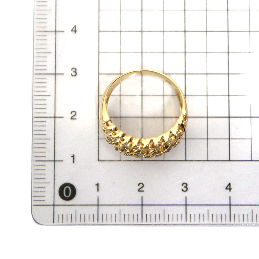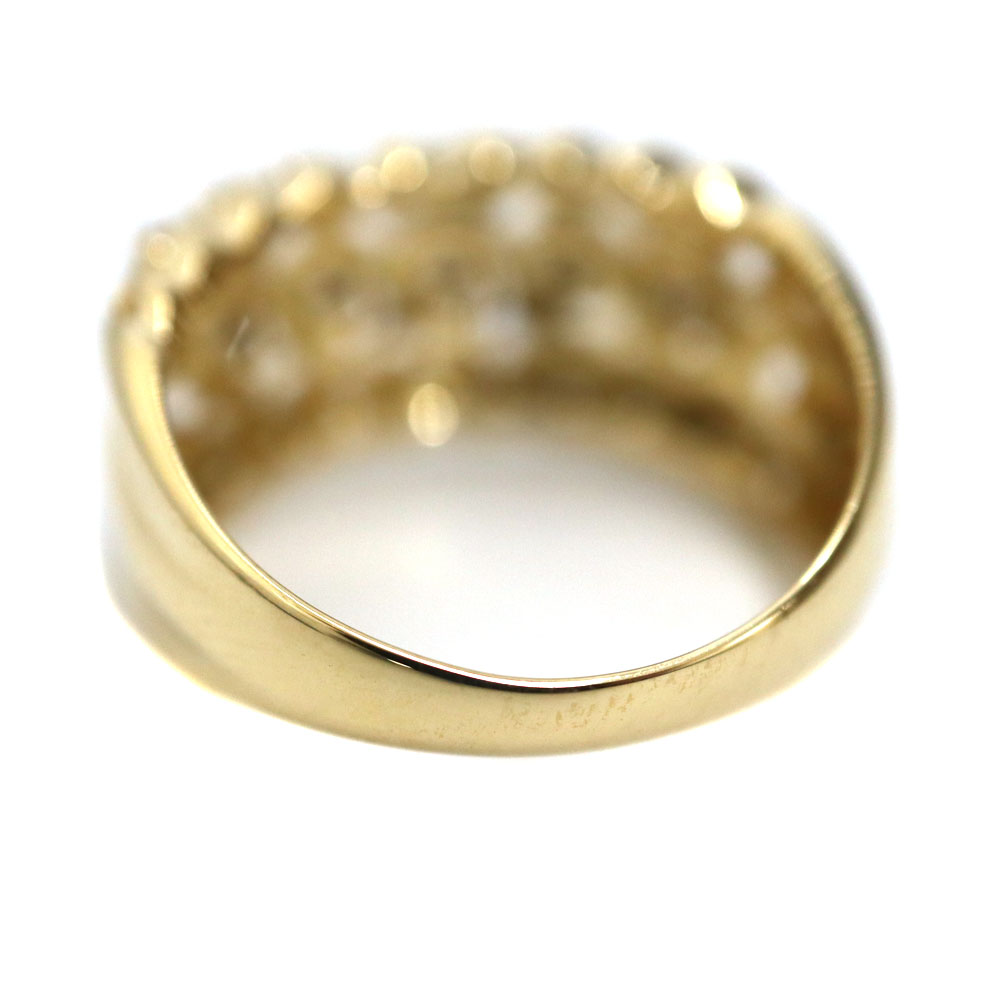 18金ゴールドを贅沢に使用し、沢山のダイヤモンドが散りばめられた華やかなリングです。 幅のあるデザインですが、曲線的なフォルムで指なじみが良く、存在感とエレガンスを兼ね備えた仕上がりです。 こちら1つ身に付けるだけで手元を華やかに彩る、大人のためのジュエリーです。 この機会に是非いかがでしょうか。