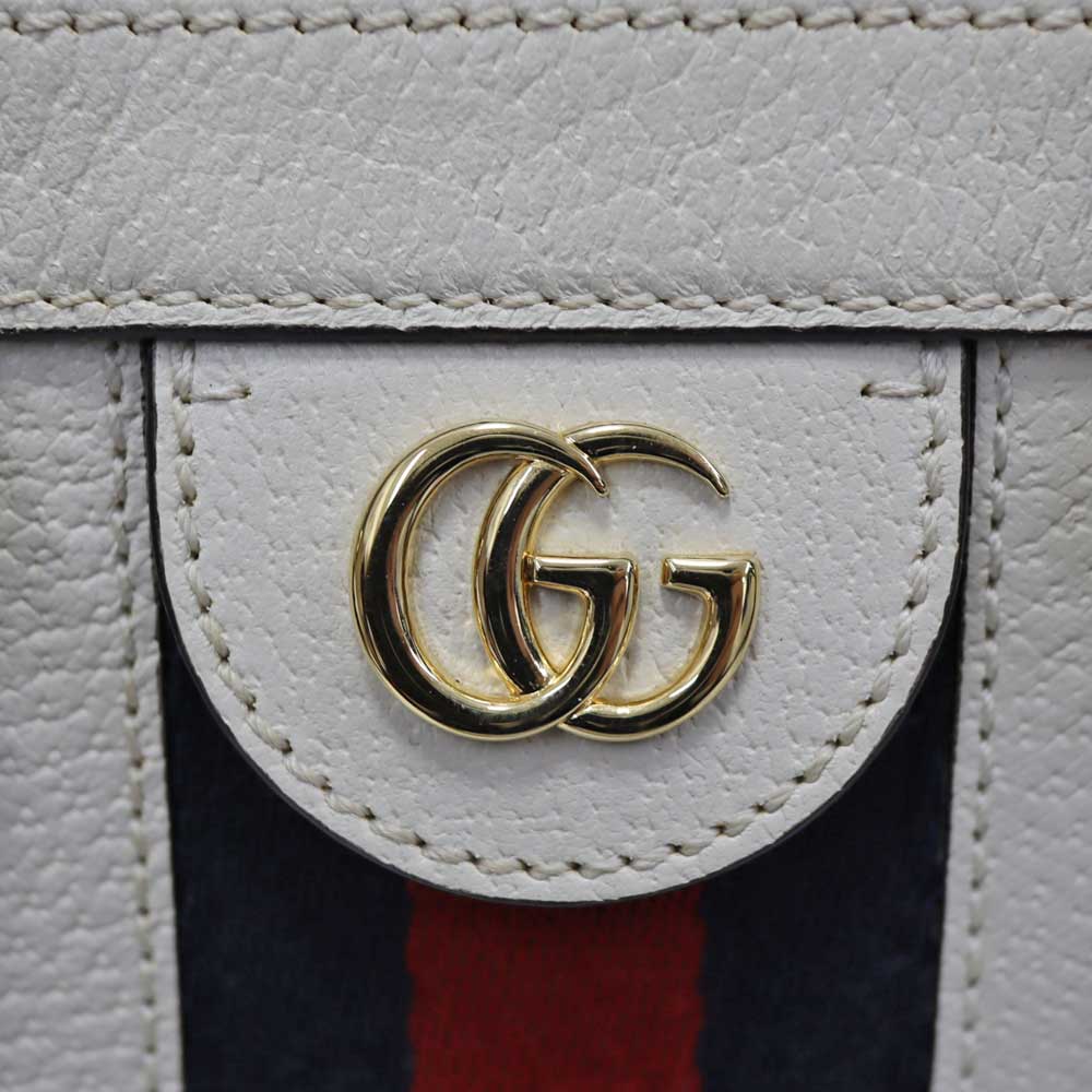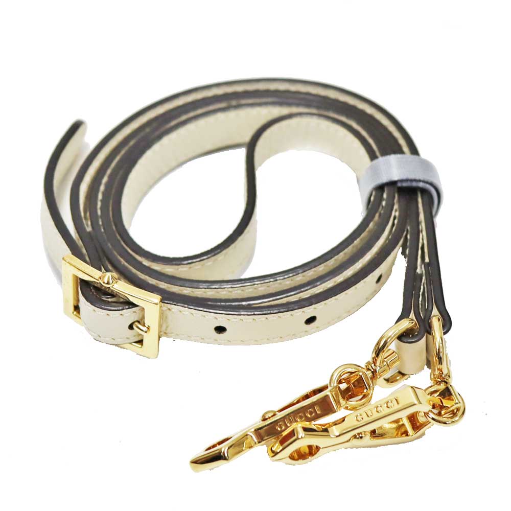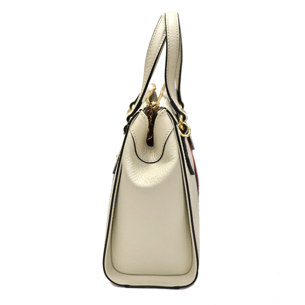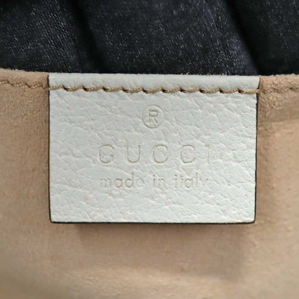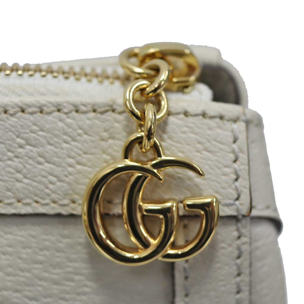 上質なホワイトレザーに、ネイビー×レッドの縦ラインが映え、フロントに配されたGGロゴがブランドらしい存在感を演出しています。 程よいサイズ感で収納力もあり、デイリーからお出かけまで幅広いシーンで活躍するアイテムです。 ショルダーストラップ付きのため、ハンドバッグとしてはもちろん、ショルダーバッグとしてもコーディネートやシーンに合わせて使い分けが可能です。