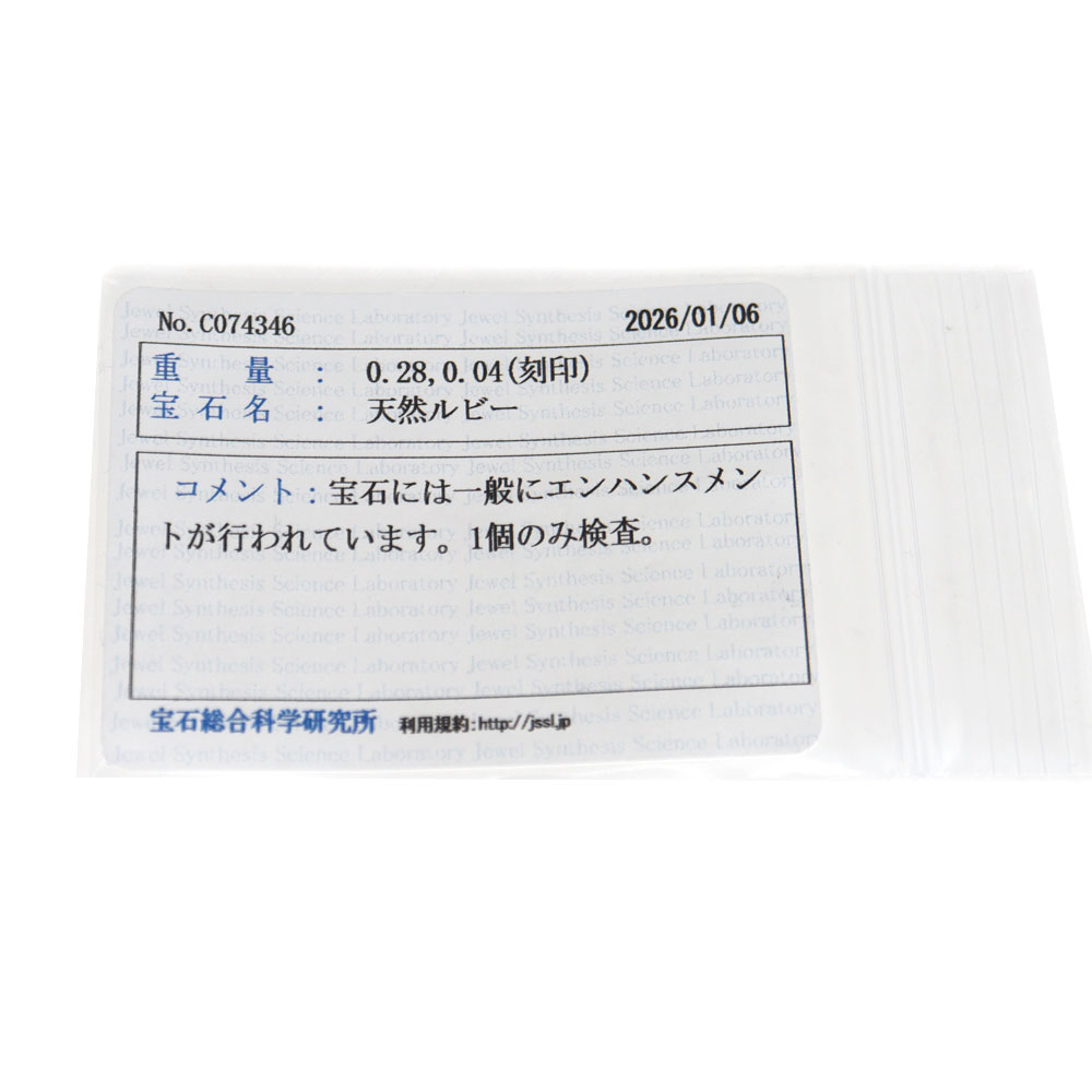 | 重さ | 総重量約:1.6g ルビー:0.28ct ダイヤモンド:0.04ct |