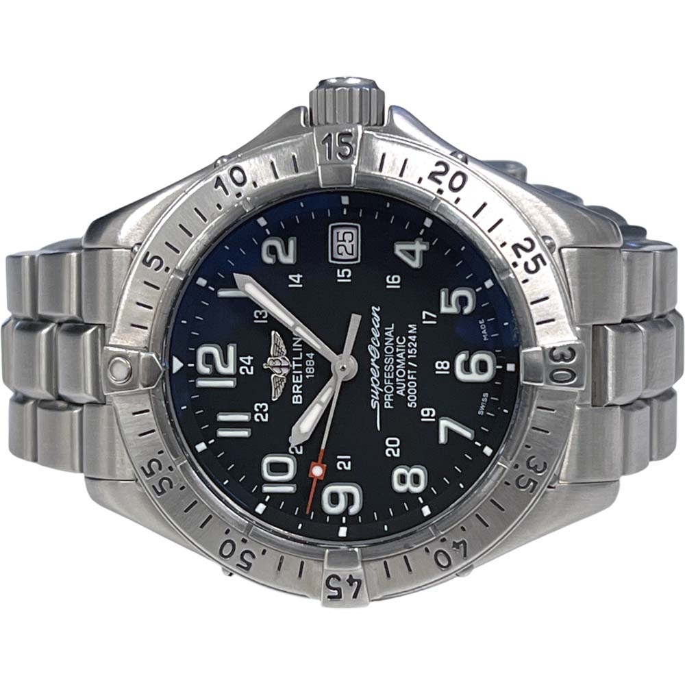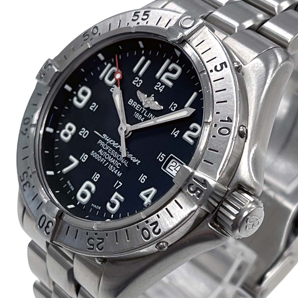| 商品説明 | ブライトリングの「スーパーオーシャン プロフェッショナル」A17345は、ダイバーズウォッチとして設計されており、高い防水性能を持っています。堅牢なステンレススチール製のケースと、視認性に優れた文字盤が特徴です。信頼性の高い機械式ムーブメントを搭載しており、逆回転防止ベゼルが備わっています。このモデルは、スポーティかつエレガントなデザインで、多くの場面で活躍する時計です。